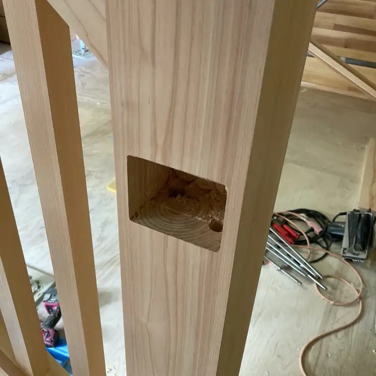 お得意の手すり・親柱に配線埋め込むヤーツ。出来上がってみるとすんなり収まっているので気にも留めない場所ですが、結構凝ったことしています笑