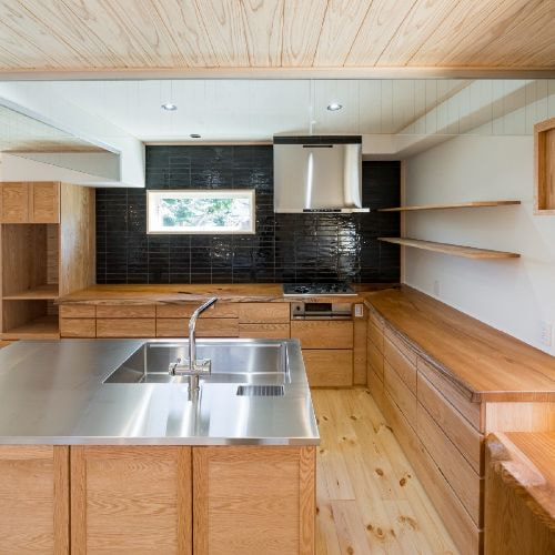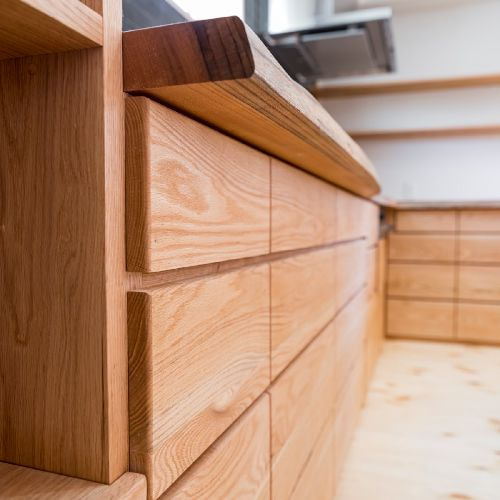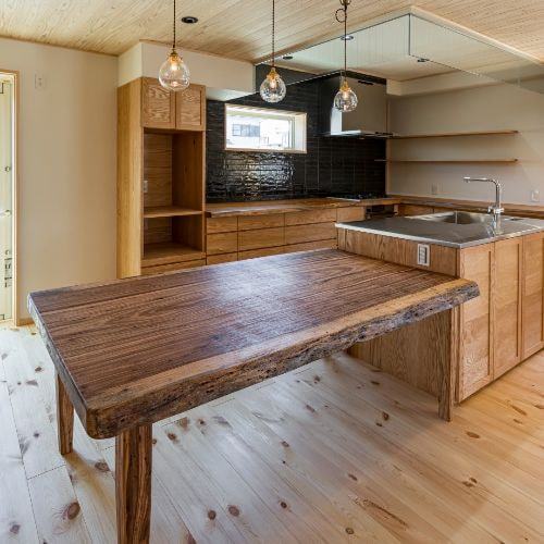 ✔️二枚の大きなケヤキ板から削りだしたL型キッチン