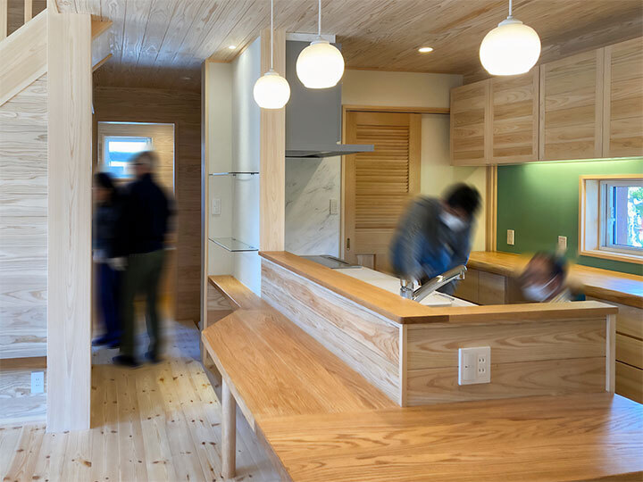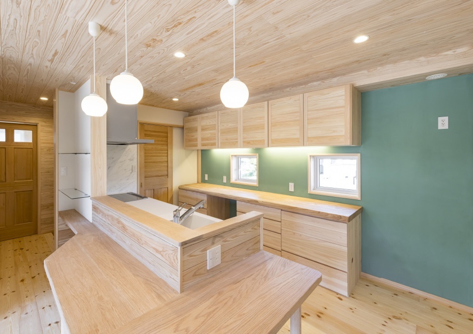 ✔️グリーン壁がアクセントのキッチン背面収納は幅3mの大容量