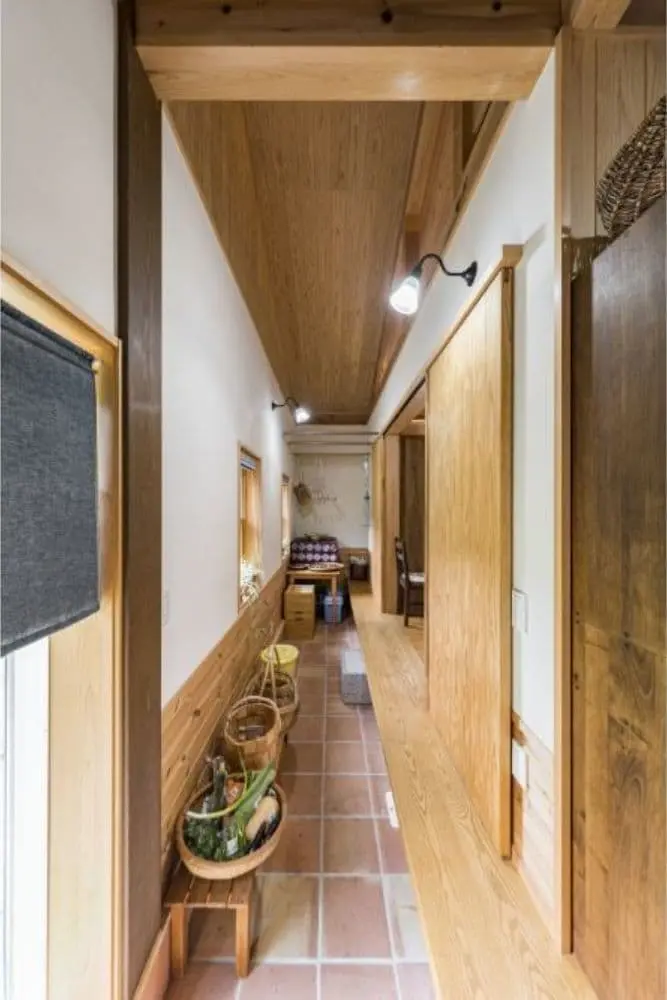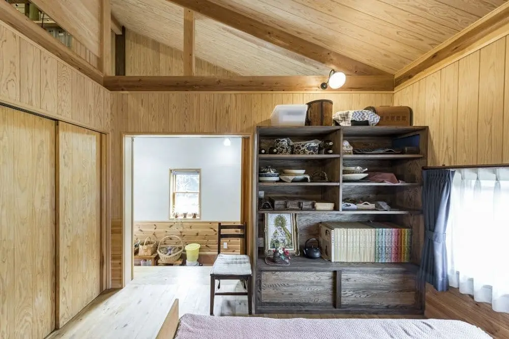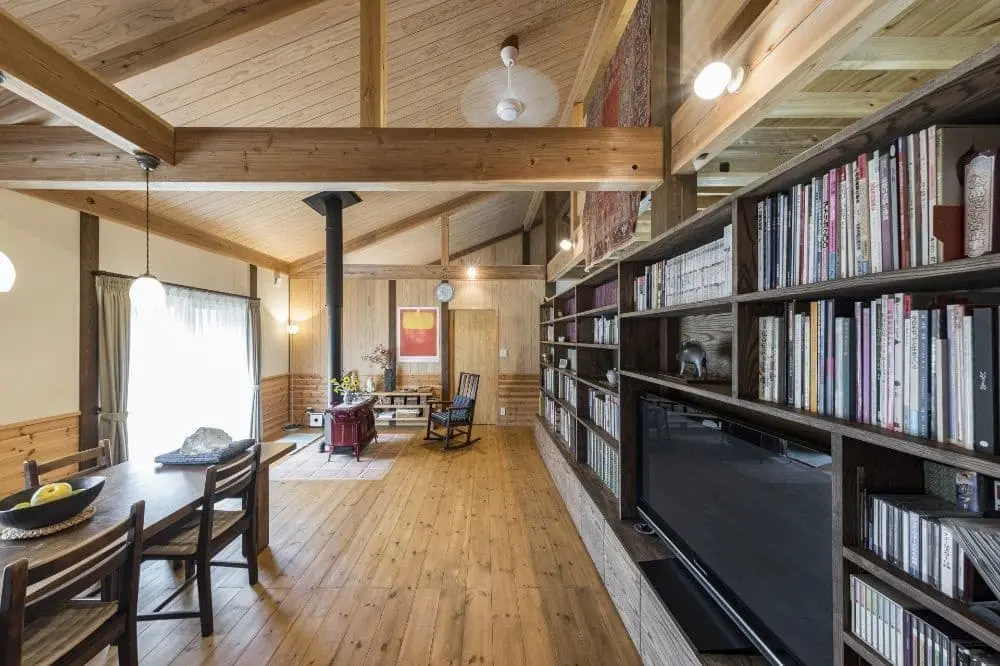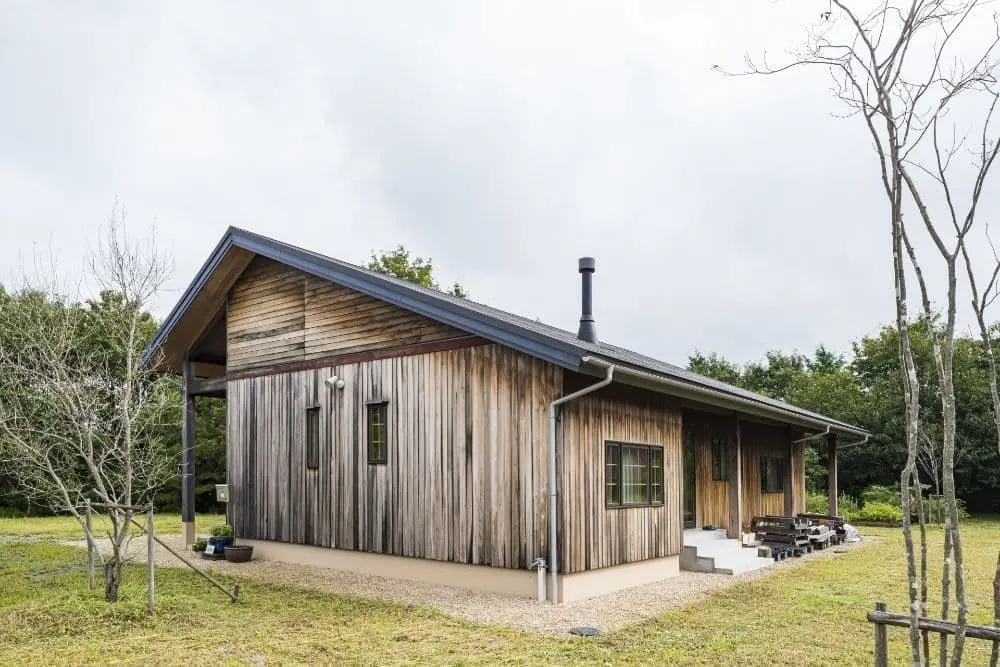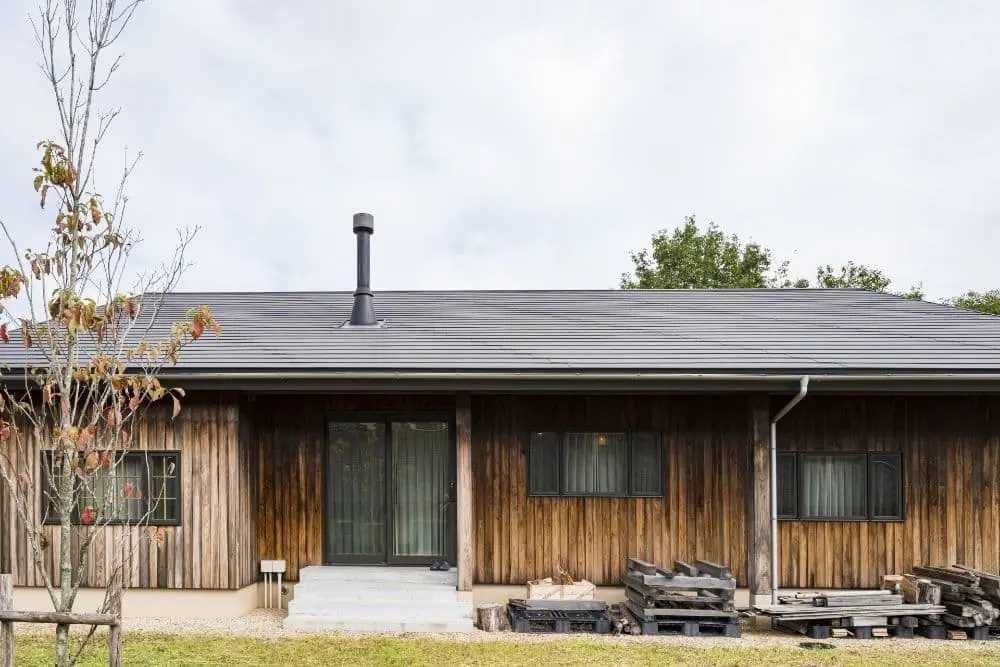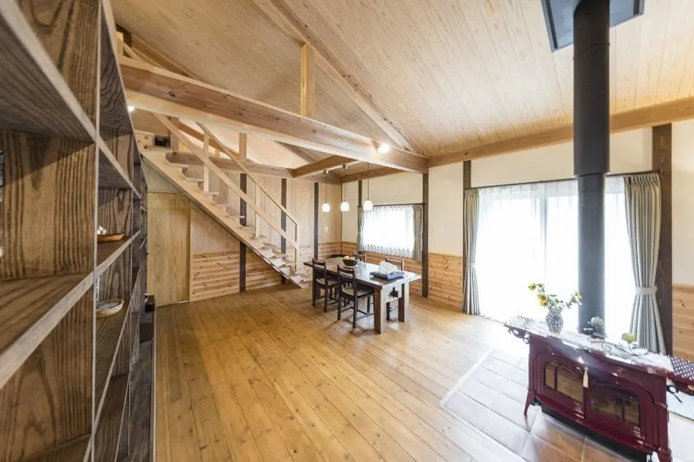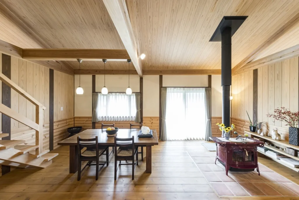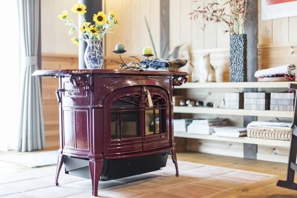 赤い薪ストーブのある家