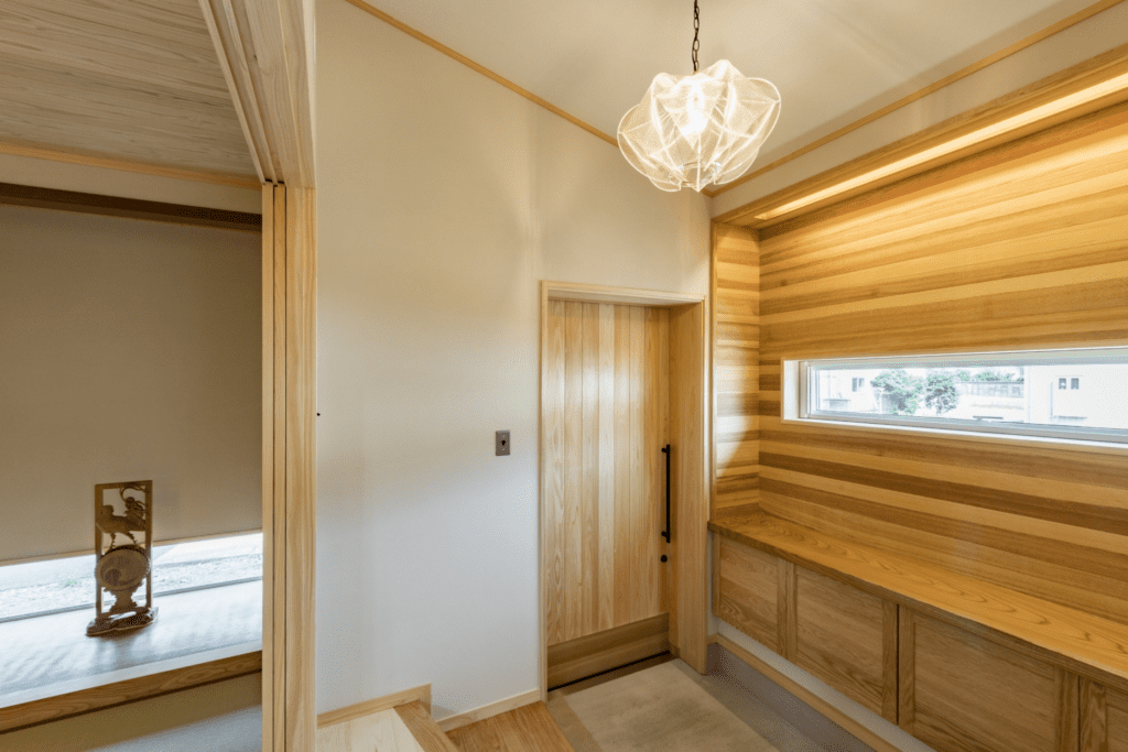 下駄箱カウンター・上がり框・式台をケヤキで統一した玄関にアクセントに貼ったラオス松の壁。お施主様持ち込みの照明が良く合う。