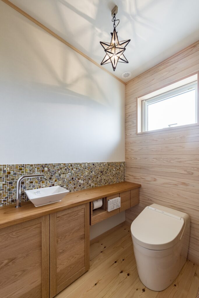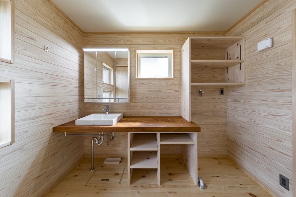 洗面、脱衣所をあえてキッチン裏に設けプライベートゾーンとしています。北に設けた寝室とトイレを近づけて将来も安心の間取りとなりました。