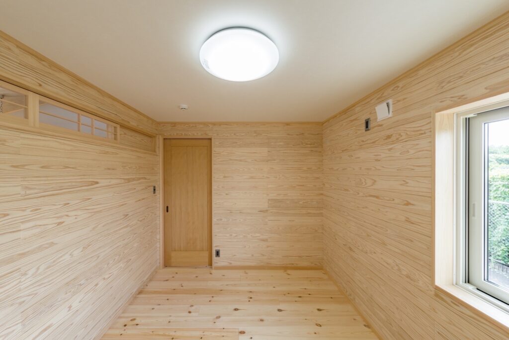 仕事部屋。左にはリビングからの明り取り、奥の扉から勝手口へ繋がる。木を扱う仕事で木くずが出るため照明器具はシーリングライトにして掃除が楽なように。