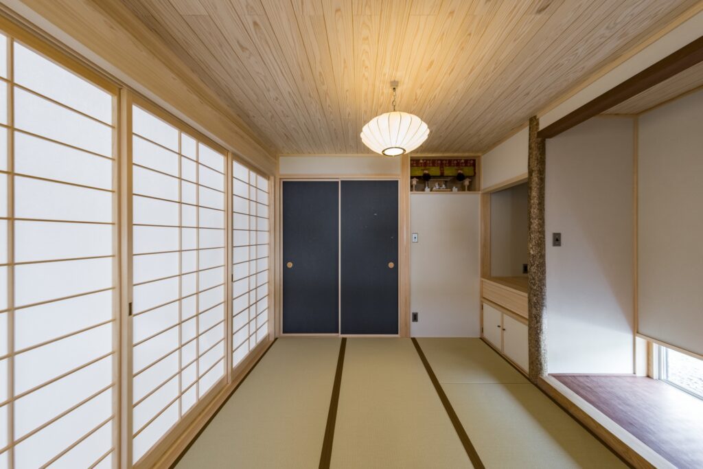 和室は神棚を誂えお施主様お手製の神具を祀るスペースを設けた。床板にはパープルハート、床框はケヤキ、床柱は錆丸太。全てせこ住研の熟成倉庫の木材を使用。