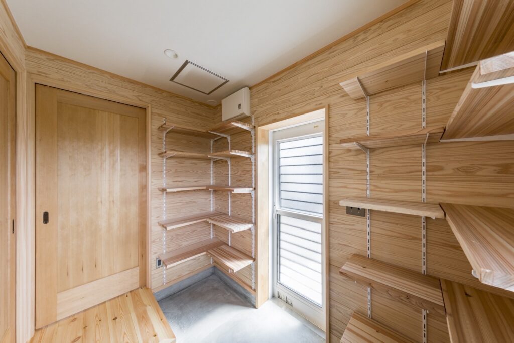 仕事部屋は土間勝手口の隣で駐車場との行き来を考慮して。土間には仕事道具が置けるように。また隣のご実家にもスムーズにアクセス出来ます。