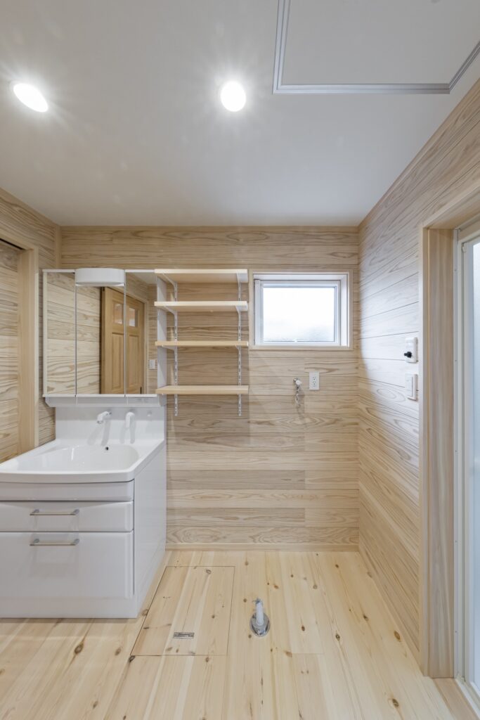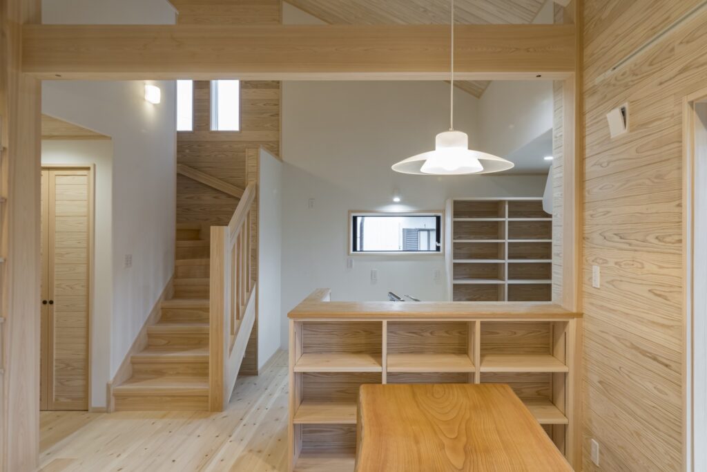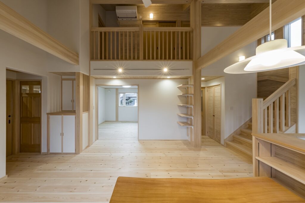 玄関ホールを抜けた先には階段が一体となった明るいLDK。リビングには仏壇やパソコンコーナーを設けました。続く寝室をオープンにすることでワンルームに変身。廊下のない間取りは水廻りや土間までダイレクトに移動できます。寝室からも水廻りへ行ける回遊型でシンプルな間取りは1階20坪の1階完結型としました。