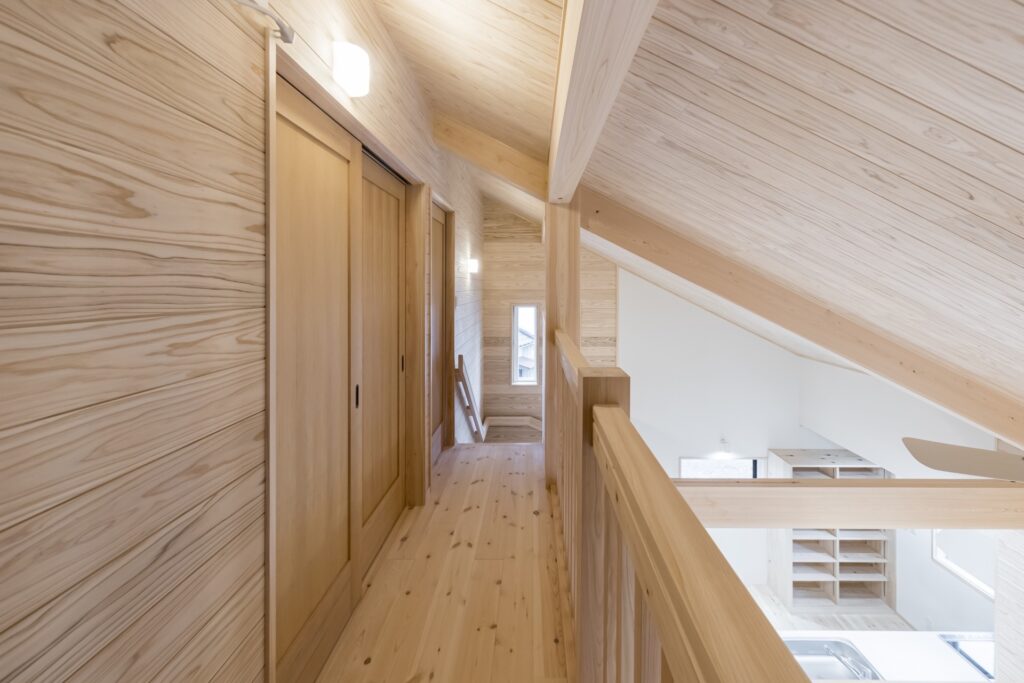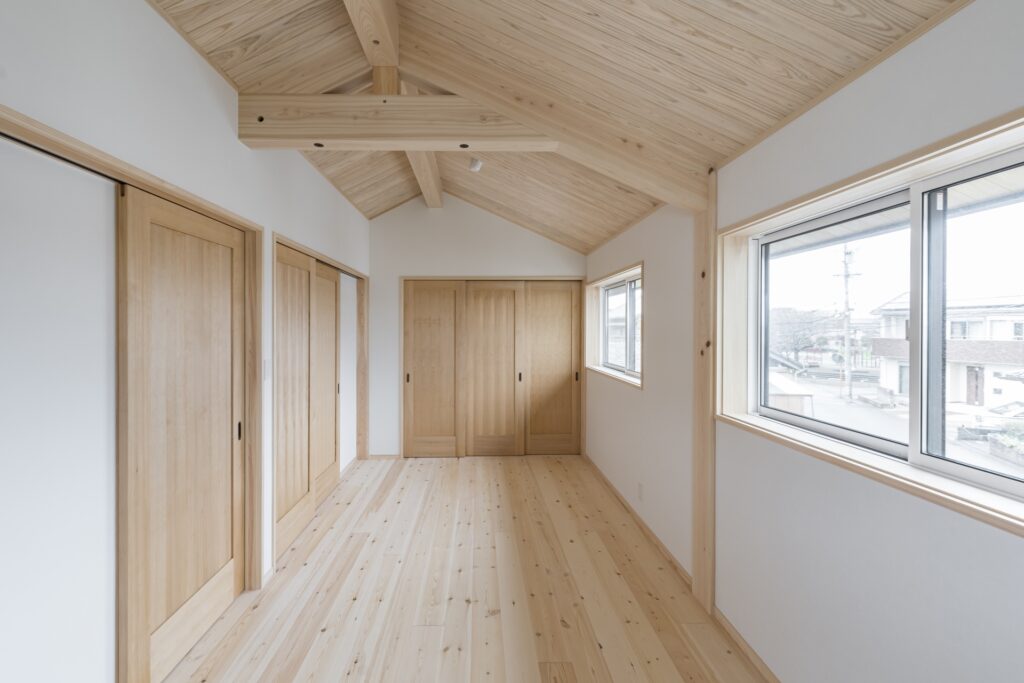 屋根勾配を活かした2階ゲストルーム。北側にしっかりと窓を取ることで出入建具を閉めていても日中明るい。将来2室に間仕切りも可能。正面はクローゼット。
