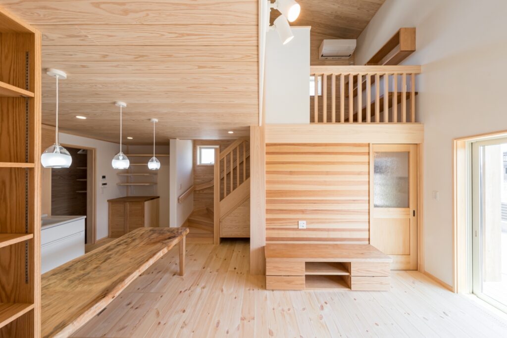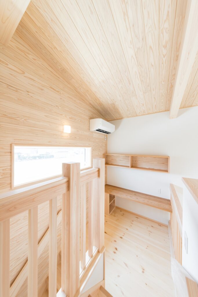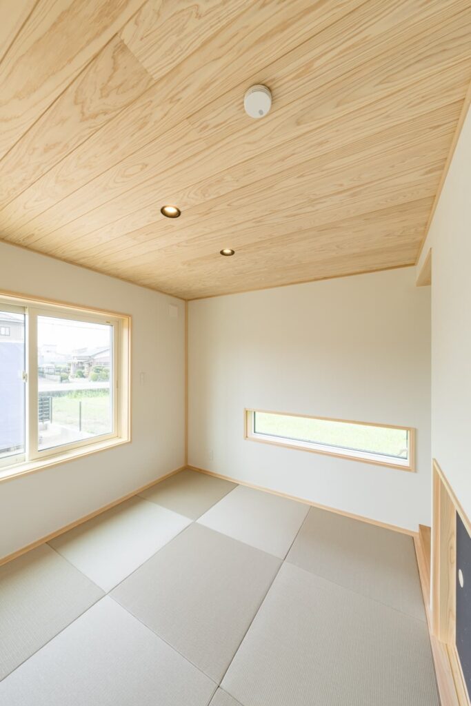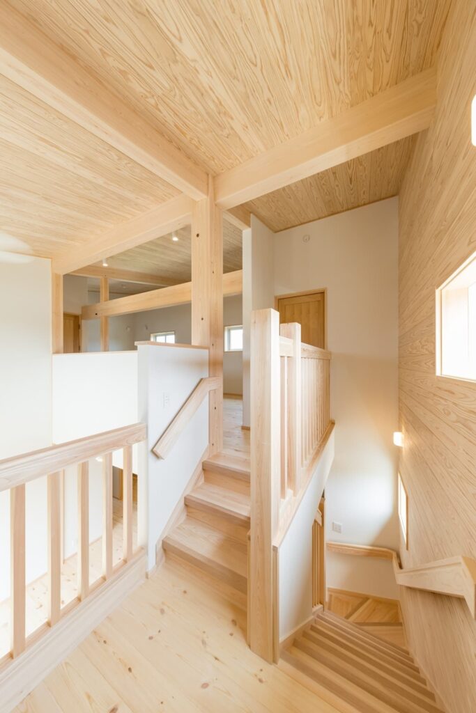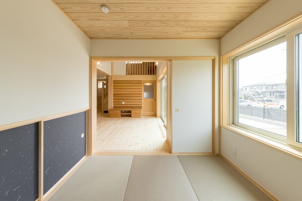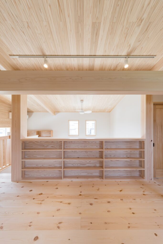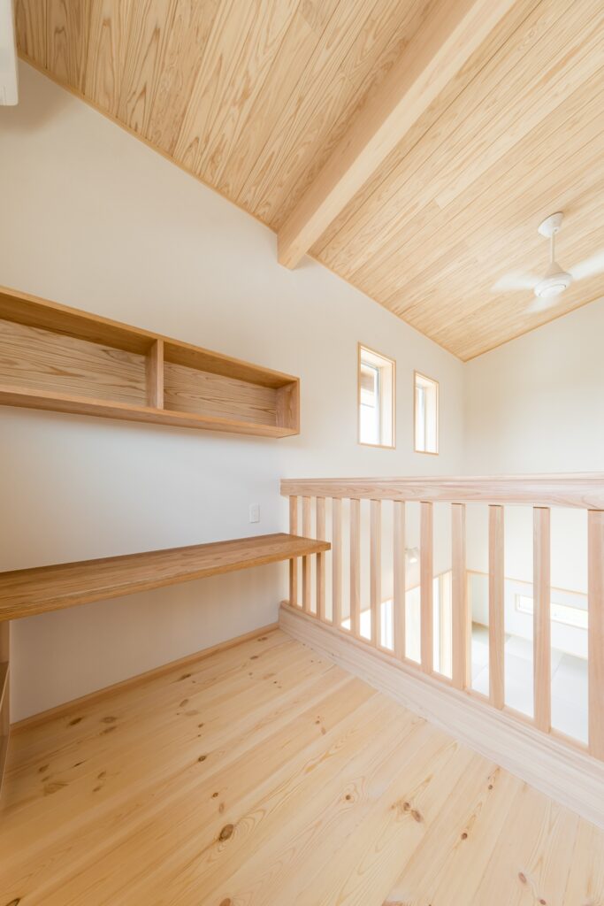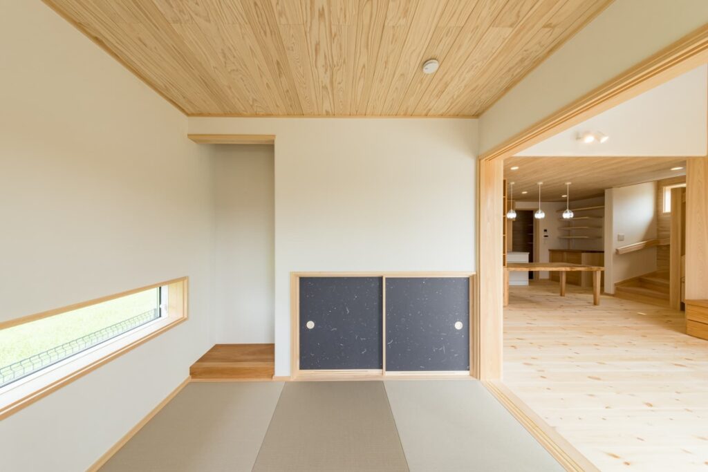 さらに吹き抜けリビングに面するように階段途中に設けたスキップフロアが空間にゆとりをもたらします。リビング横に設けた和室にも目線が届く高さとしました。