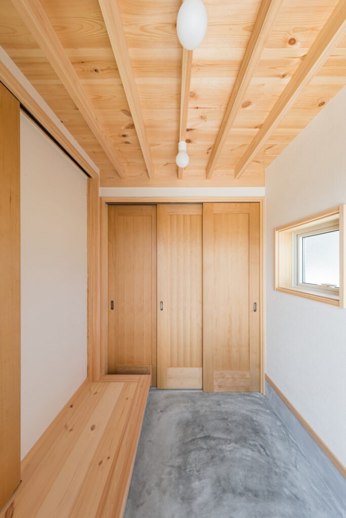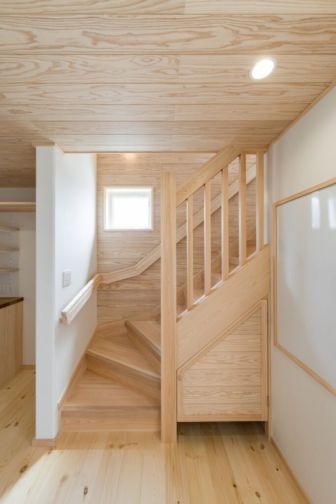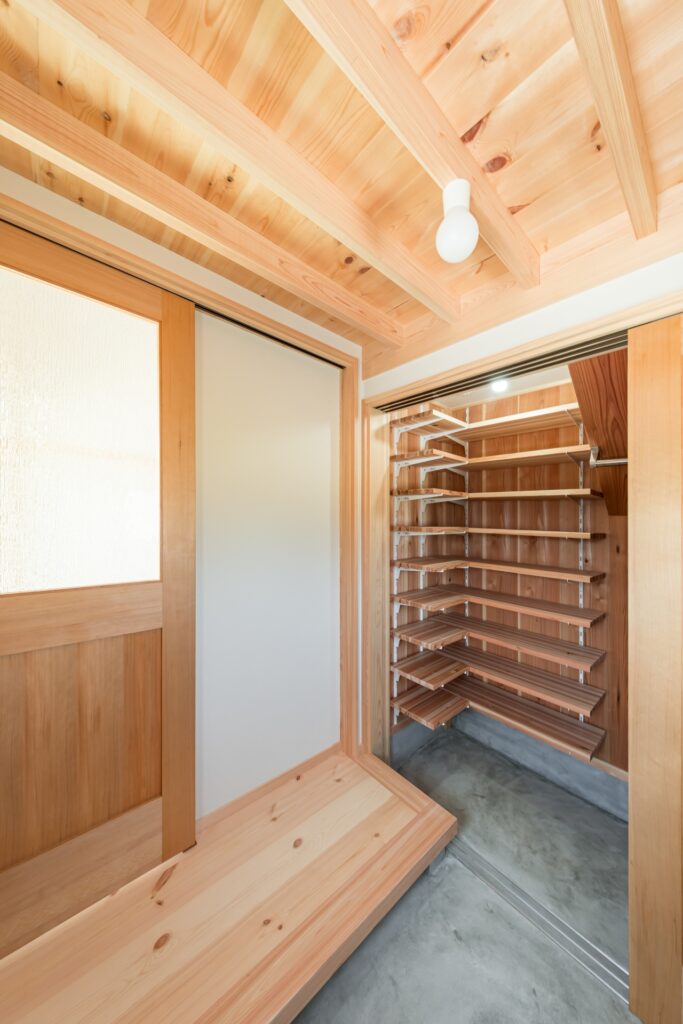 玄関の上部にはスキップフロアがあり、玄関側から階段下を一部使用した土間収納。