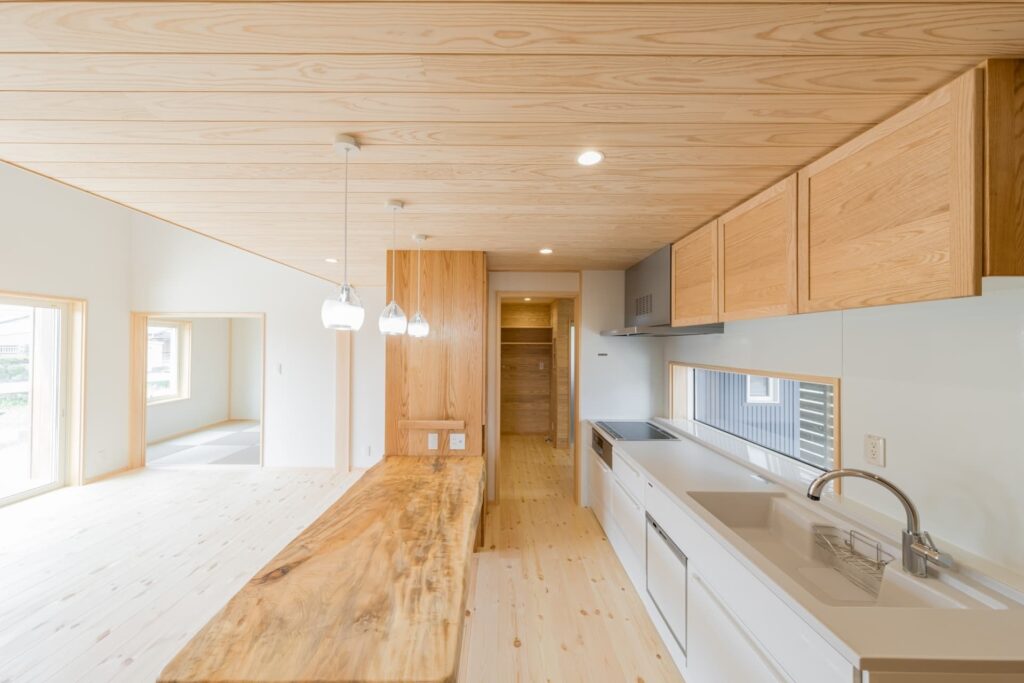 壁付キッチンでスペースを有効活用。ダイニングテーブルと収納庫を作りつけにすることでDKをコンパクトにし、リビングをしっかり確保しました。