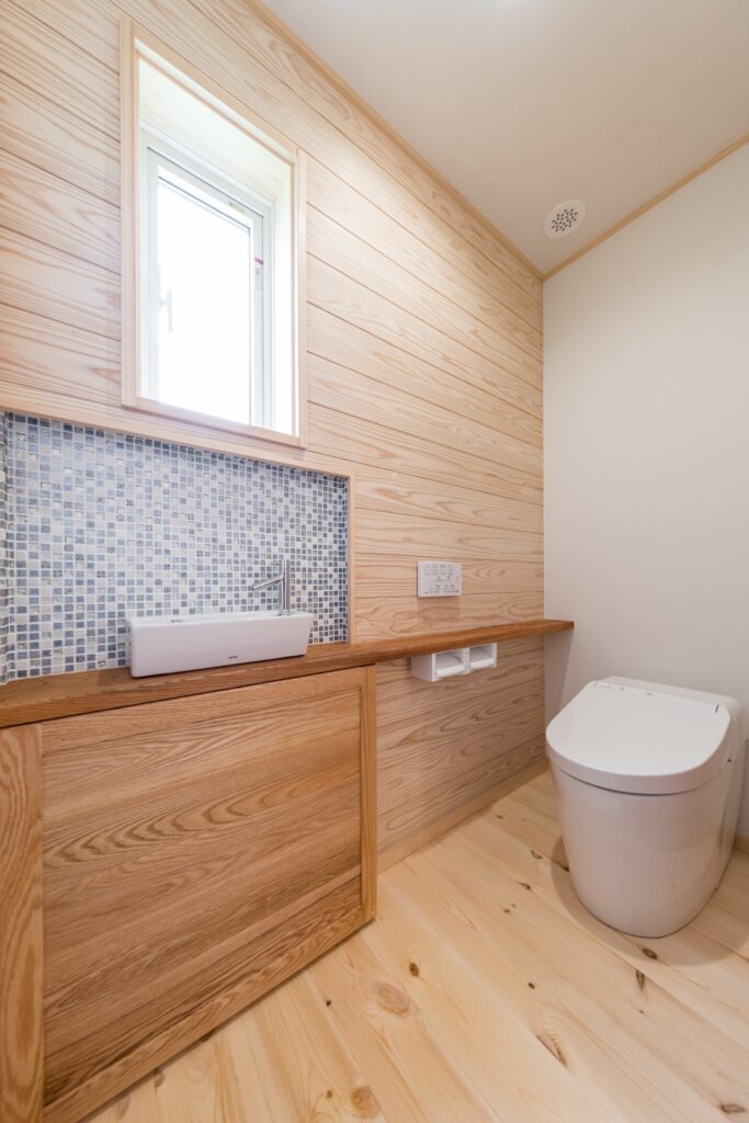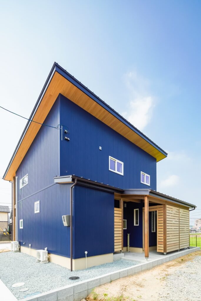 60坪の土地に総2階の間取りを計画し、庭も駐車スペースもゆとりが取れるように。また、北側には下屋を張り出し自転車置き場や外物置を作りました。そこにはご主人様ご趣味の釣りで釣った魚を外でさばけるように外流し台を設置。勝手口からキッチンへつながり、そのまま調理が出来ます。