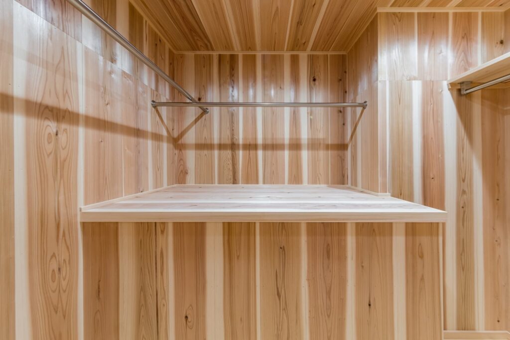 リビングテレビ台壁面のみラオス松を貼って空間にメリハリをつける。