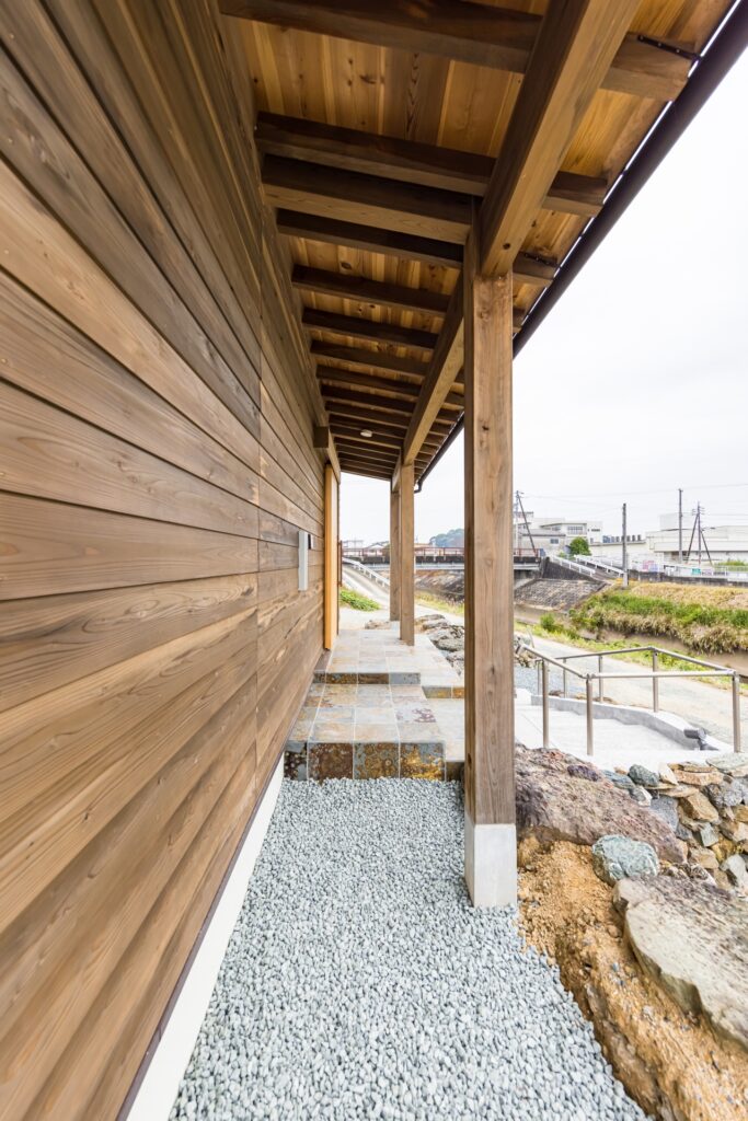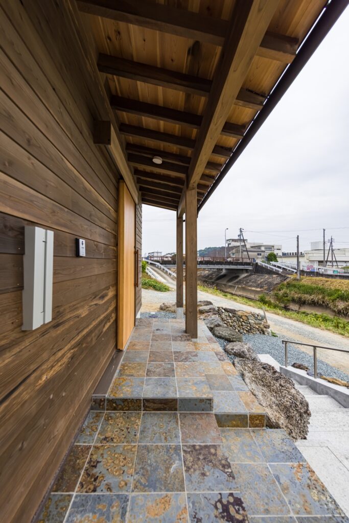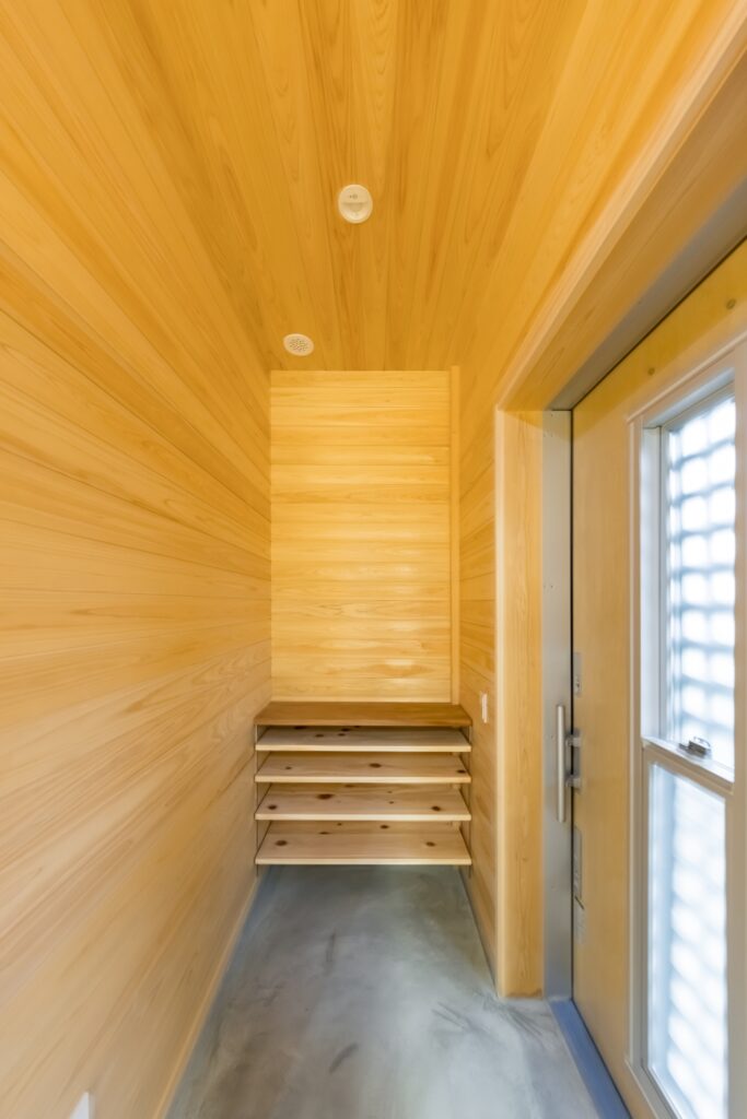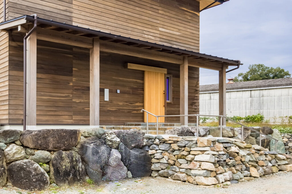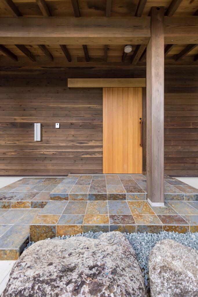 非居住スペースとプライベートスペースがある為、玄関は表と裏に2か所作りました。外観は全面杉の鎧張。伝統的な張り方です。