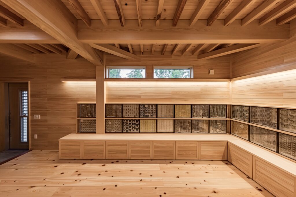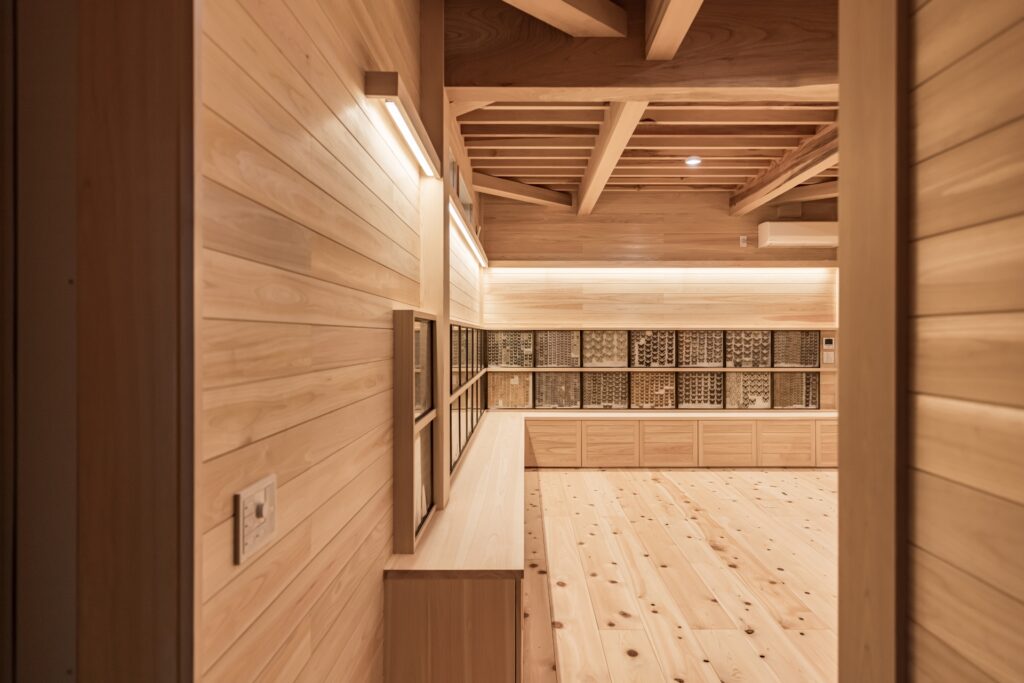非居住スペースの1階には蝶の標本展示室、施主様が所蔵の図書、お菓子を作れるミニキッチン室、書斎があり、だれでも気軽に訪れる事が出来る設計となっています。