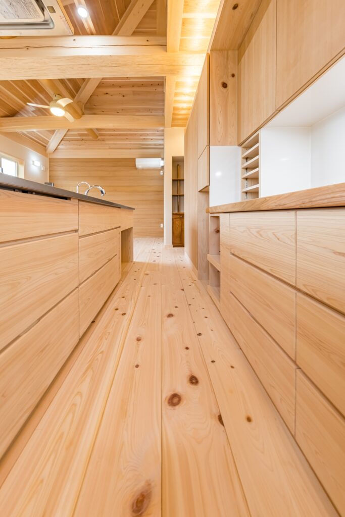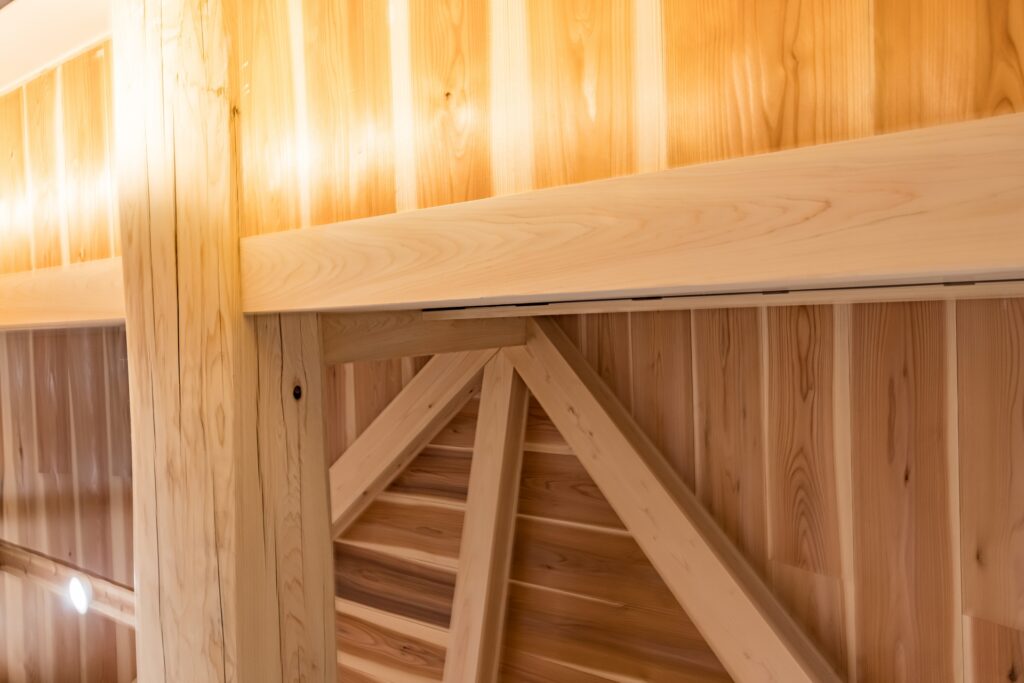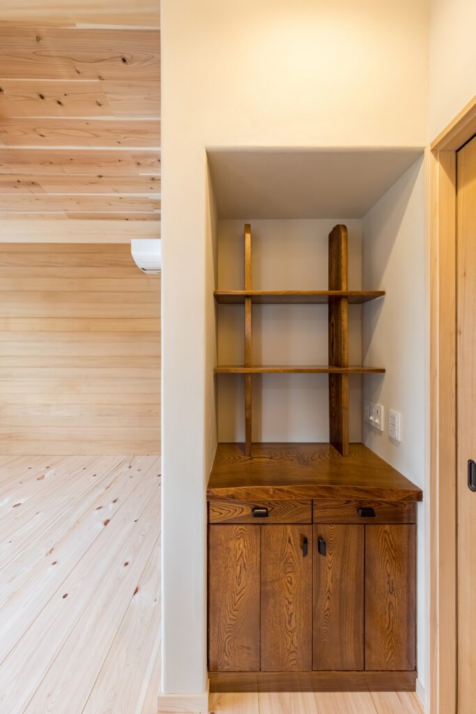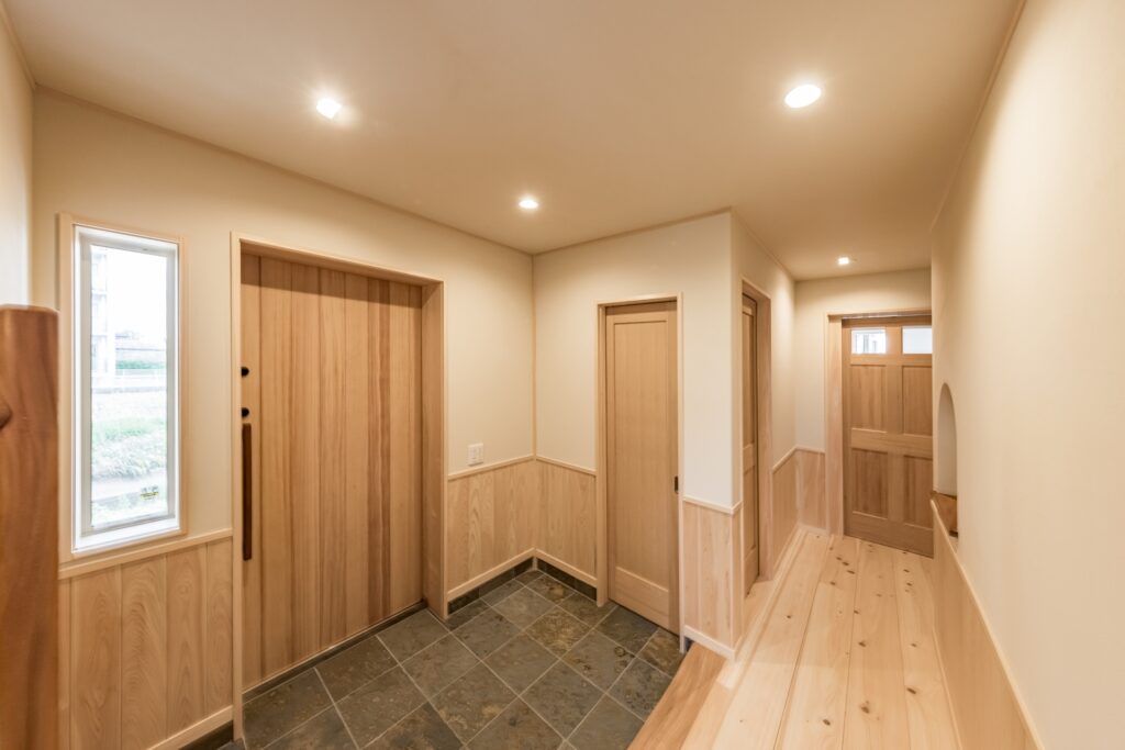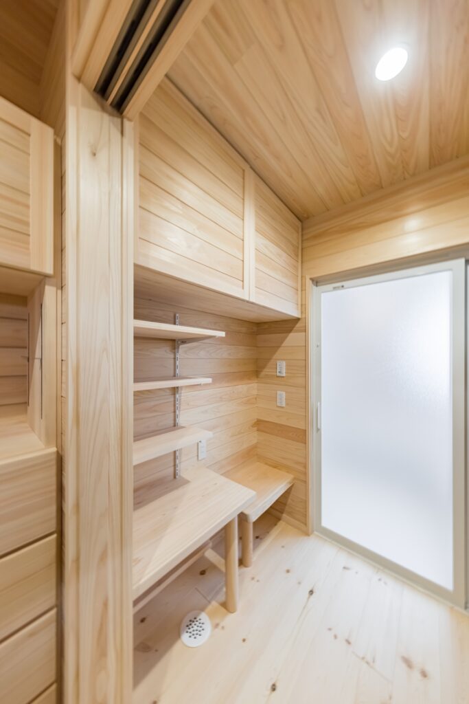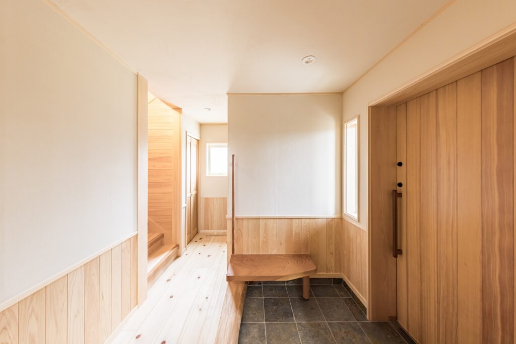 プライベートスペース側の玄関はラオス松のせこ住研オリジナル片引き戸。玄関ホールはケヤキの大きなベンチと手摺を作り、靴の脱ぎ履きや昇り降りのしやすさを考慮しました。玄関引き戸も弊社製作。玄関を一歩入った瞬間から無垢に包まれています。