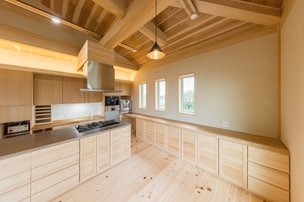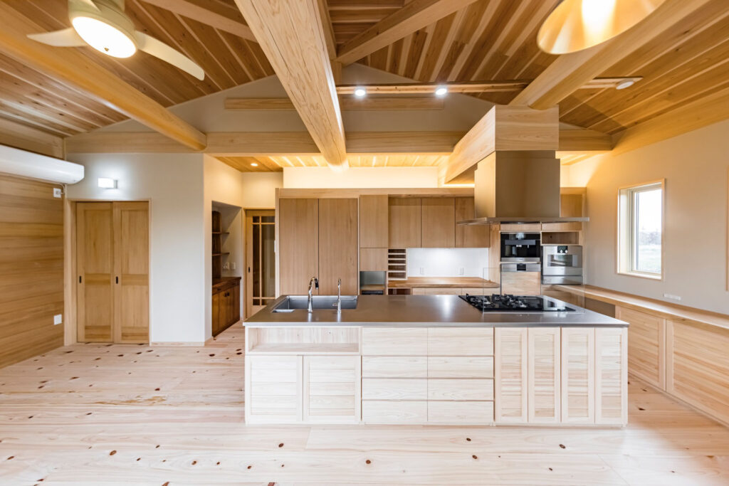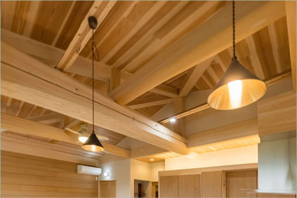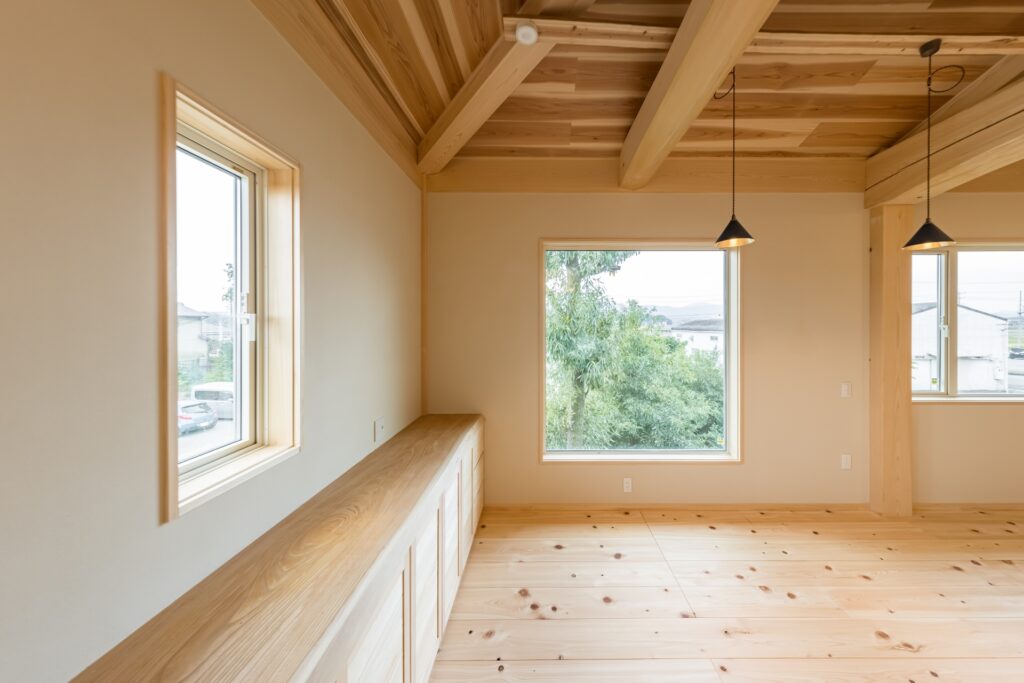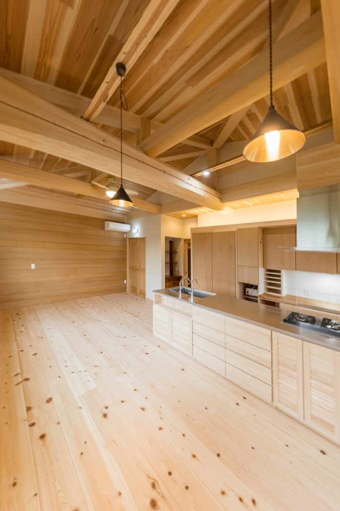 2階はプライベートゾーン。お手持ちの家具の配置と造作家具の仕様寸法を考えながらのLDKの設計。見上げると太い梁が!かなり圧巻です。