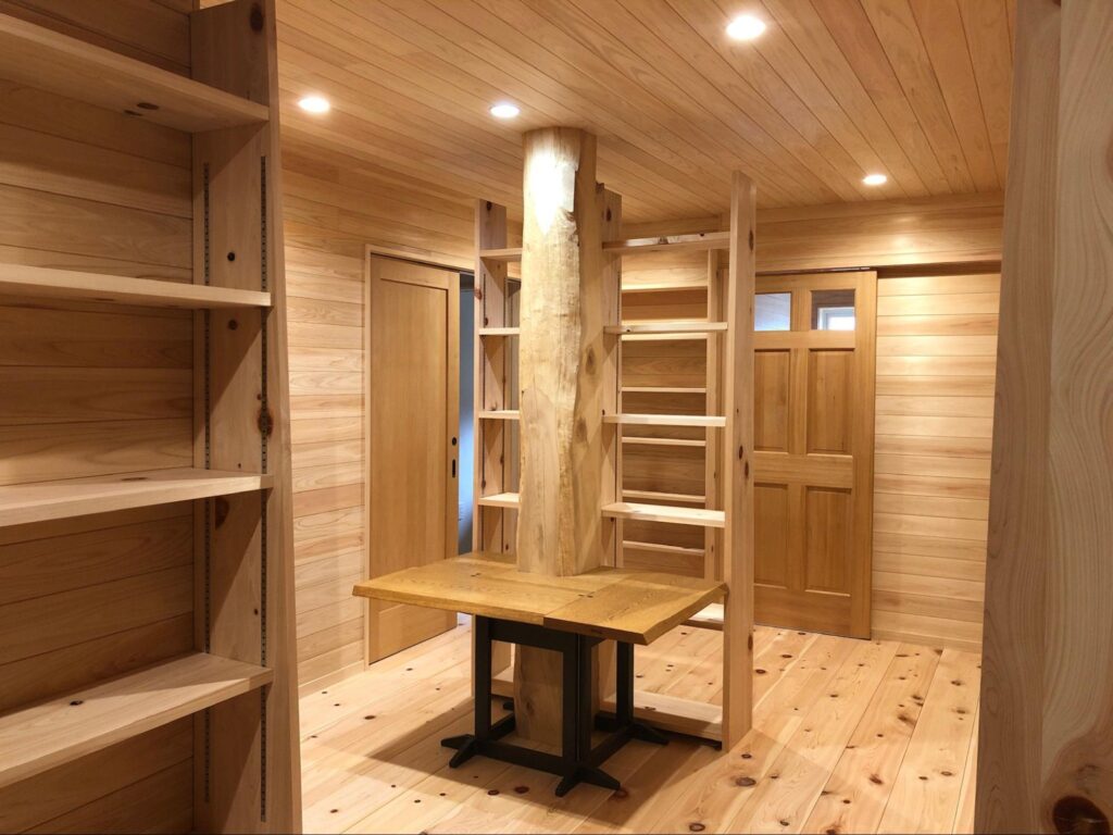 施主様所蔵の図書をたっぷり収納できます。中央にある柱を囲むのは閲覧用テーブル。