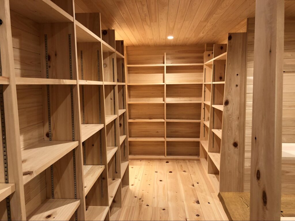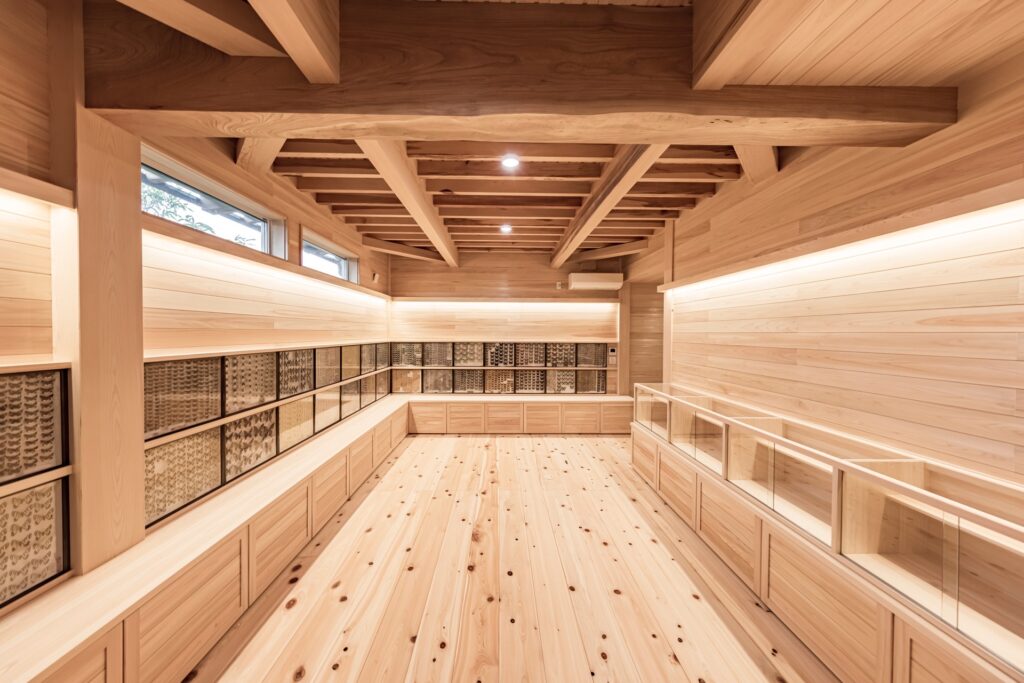 蝶の研究をされている施主様所蔵の蝶標本展示室。隣の部屋は施主様所蔵の書籍がたっぷり入る図書室があります。天井を見上げるとケヤキの太い梁。梁の高さは465ミリ!圧巻です。