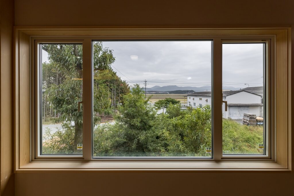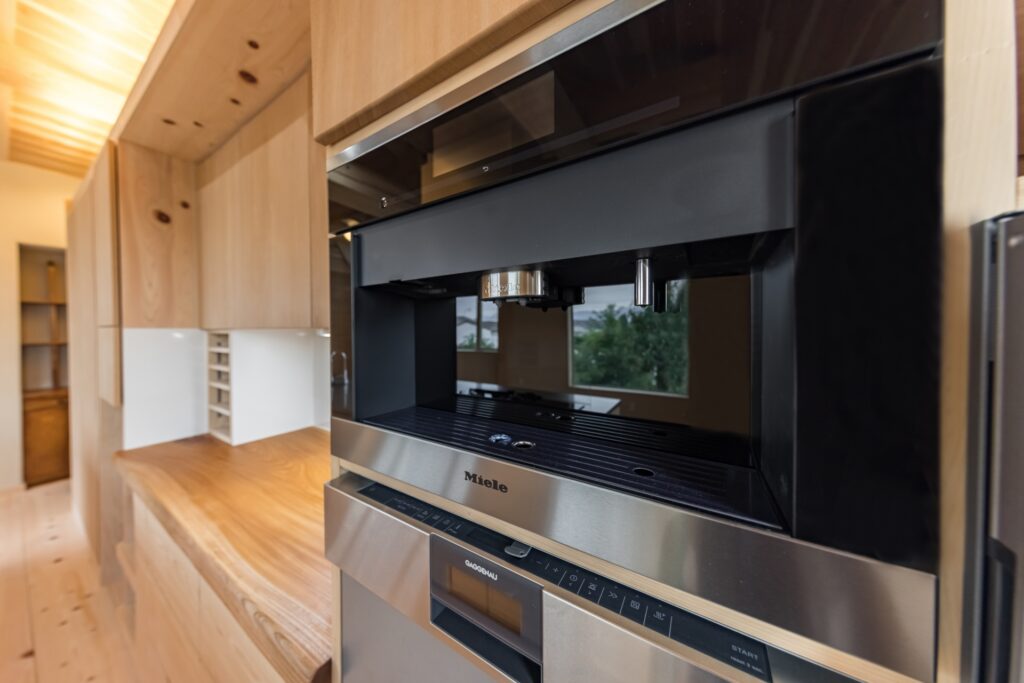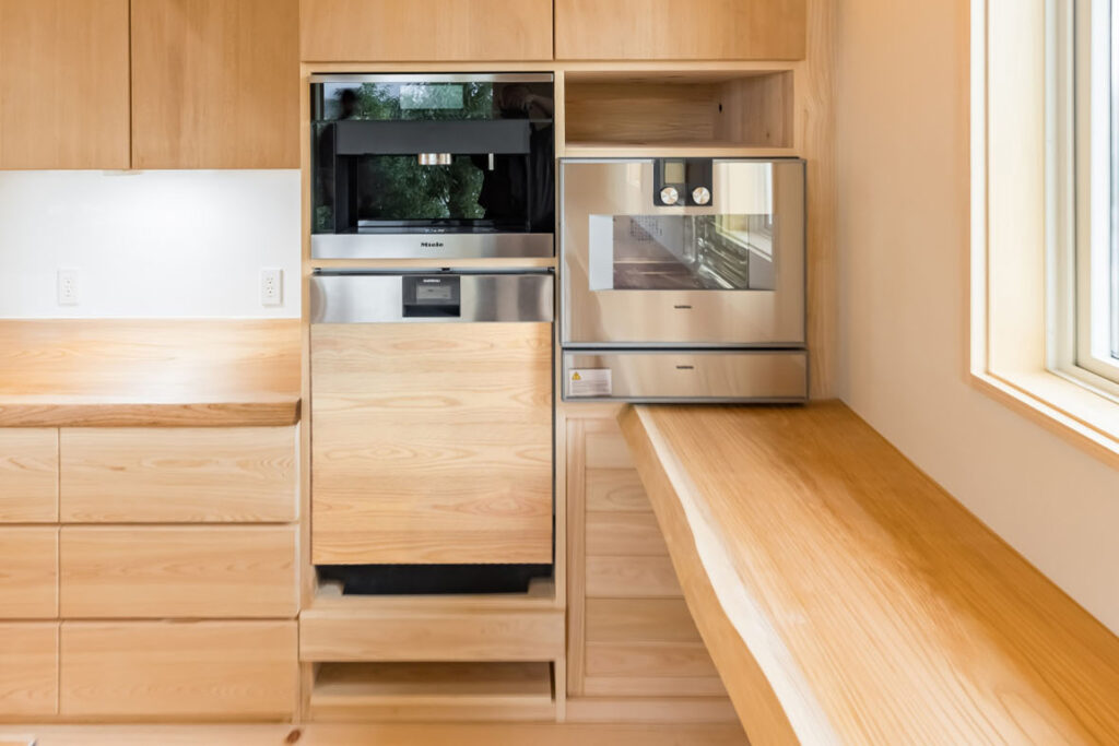 2階LDKの大きな窓の前にはベンチを置き、施主様がお手入れされているお庭や町の風景を楽しめます。季節で変わる風景を楽しみながら、ご自慢のMiele製エスプレッソマシンで入れたコーヒーは格別です。