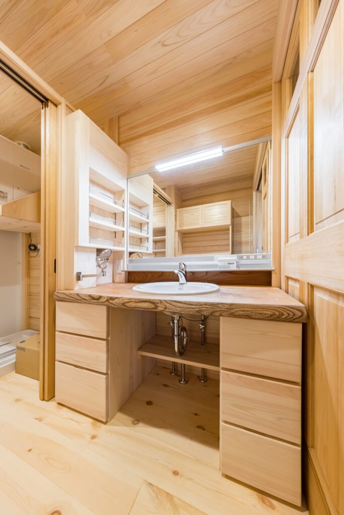 せこ住研オリジナル造作洗面台のまわりには大型ミラーと拡大鏡。拡大鏡は省スペースで使いやすい位置に移動できます。