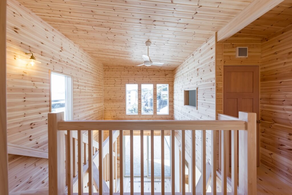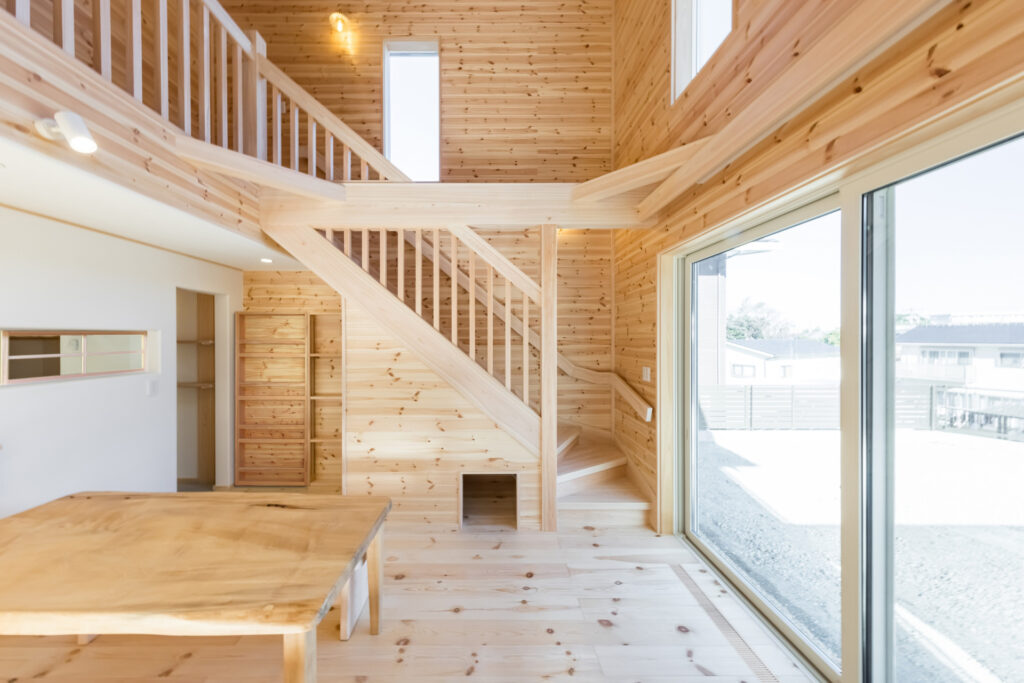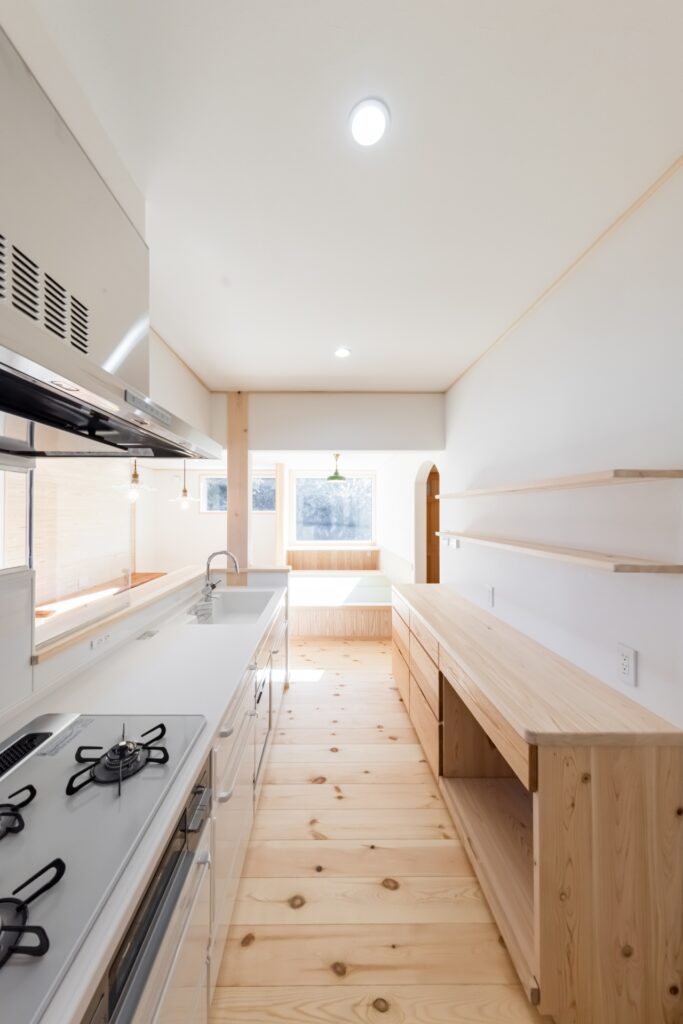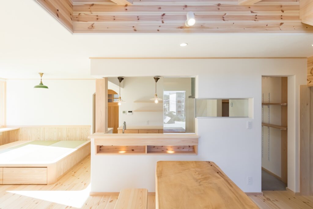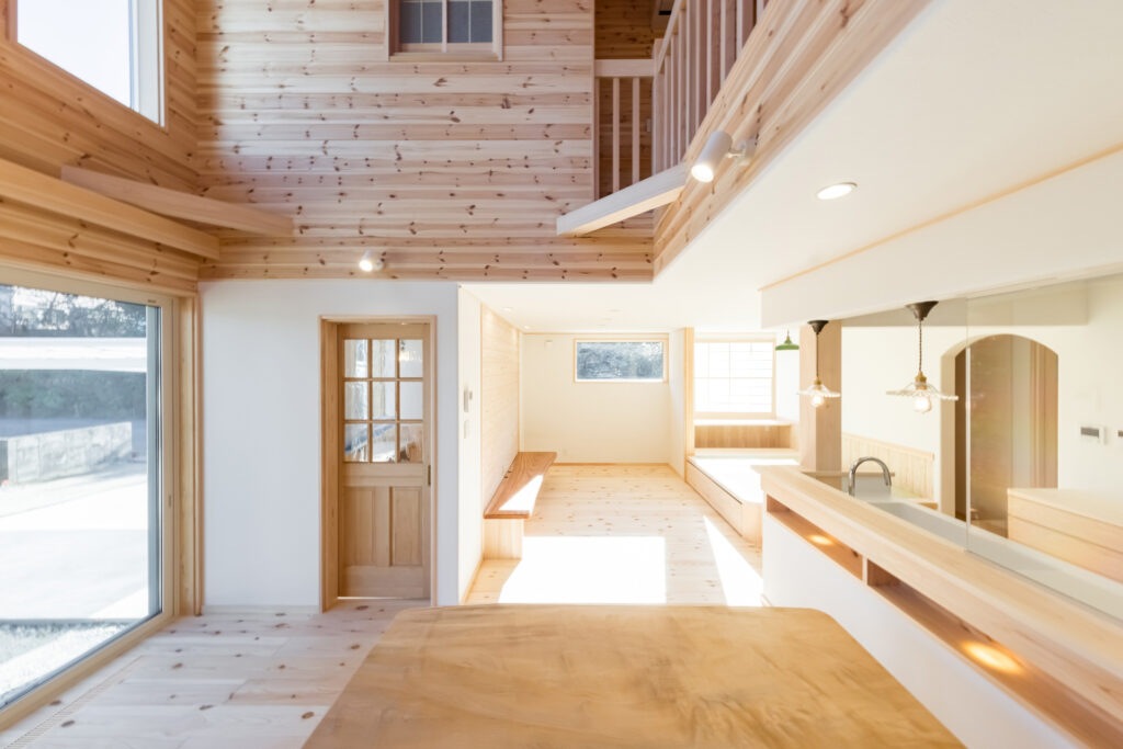 ご実家がパインの天井・壁・床に囲まれているので、全体的にパイン材をメインに設計させていただきました。