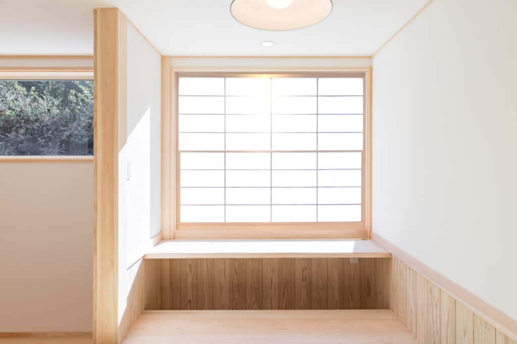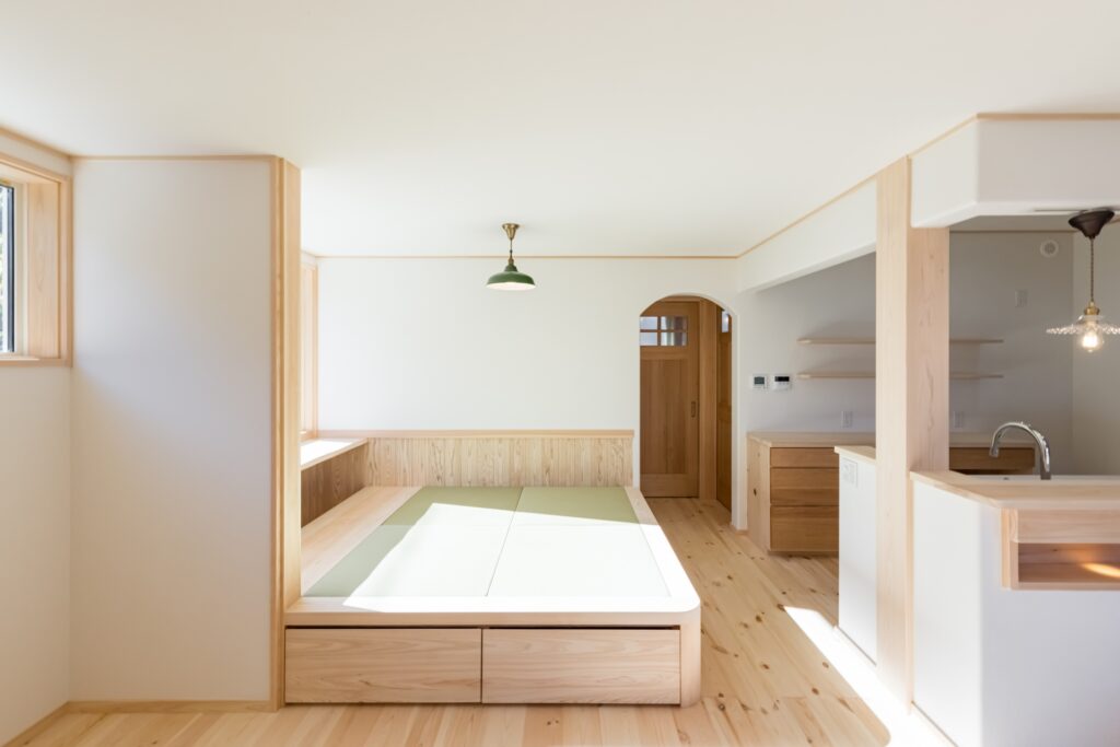 リビングダイニングはパインに囲まれますが、和室小上がりは白杉にして和風に。