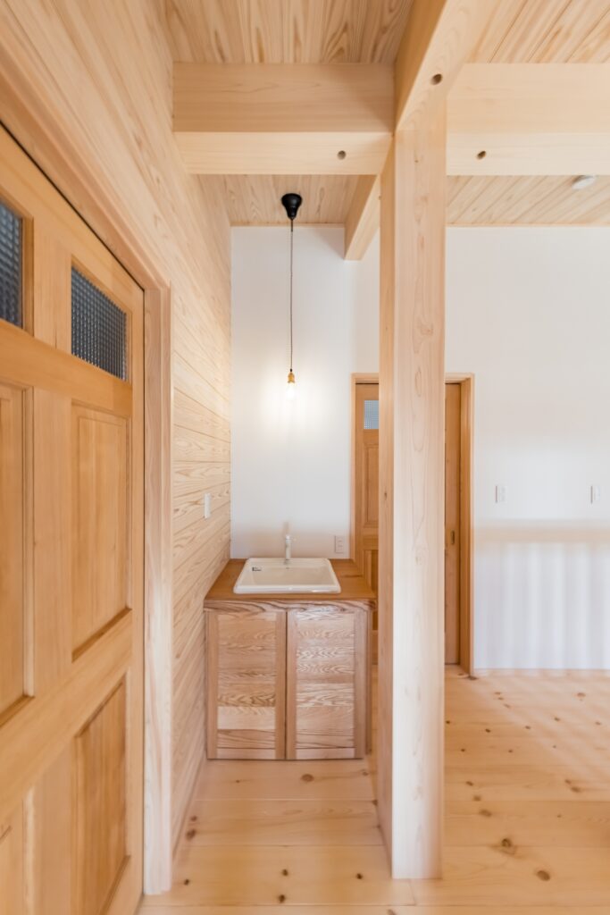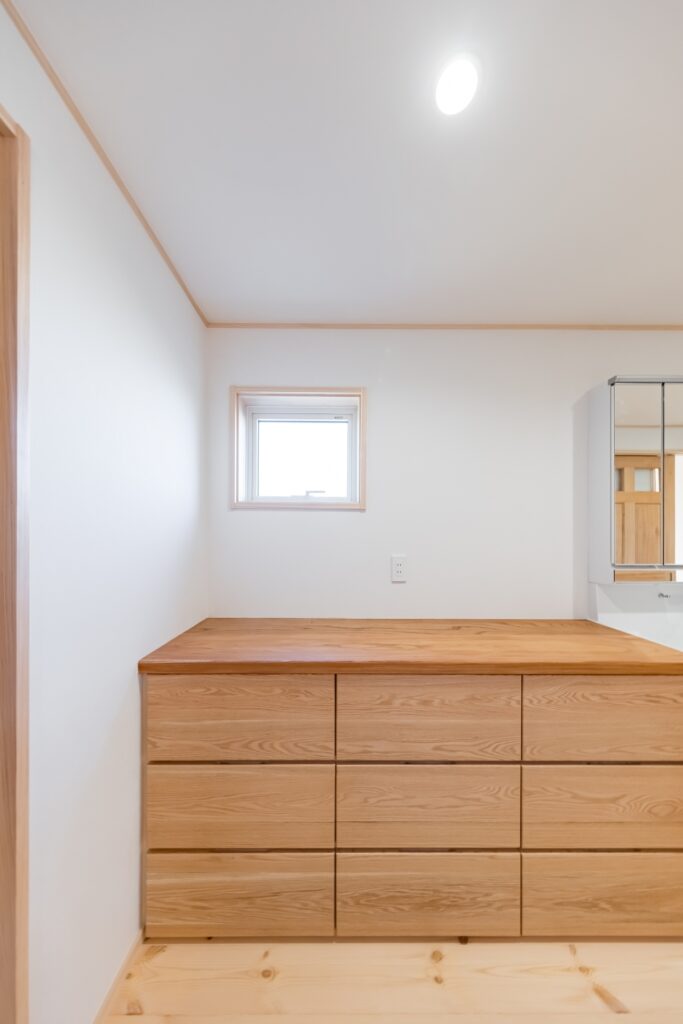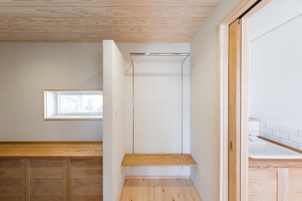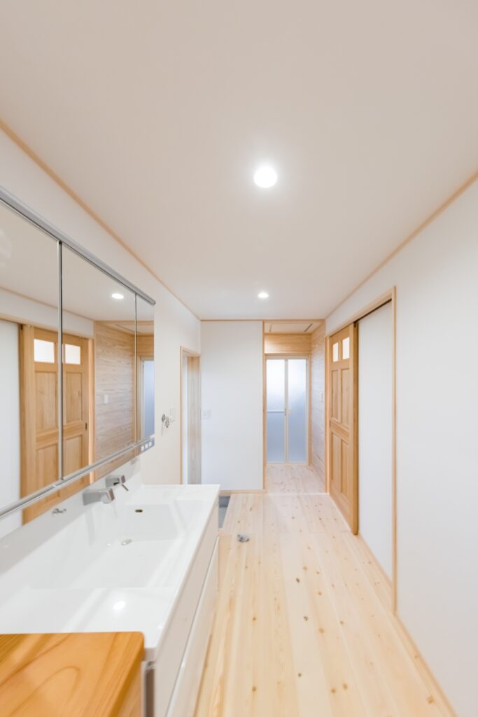 ランドリースペースを兼ねた洗面所から脱衣所までストレートに6帖。キッチン、リビング両方からアクセス出来るようにし回遊型に。外につながる勝手口も。