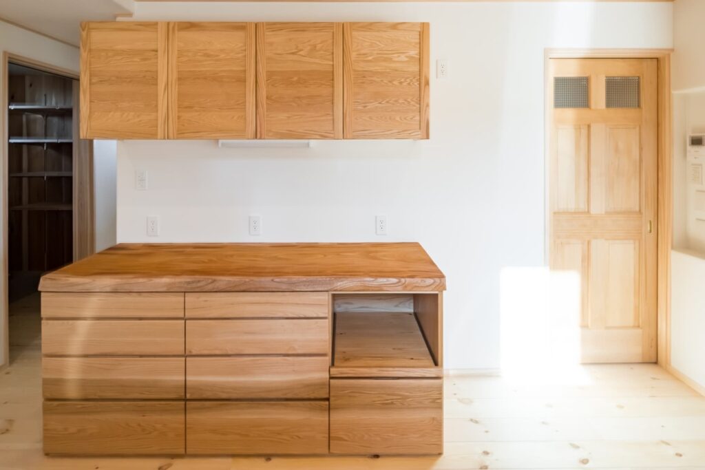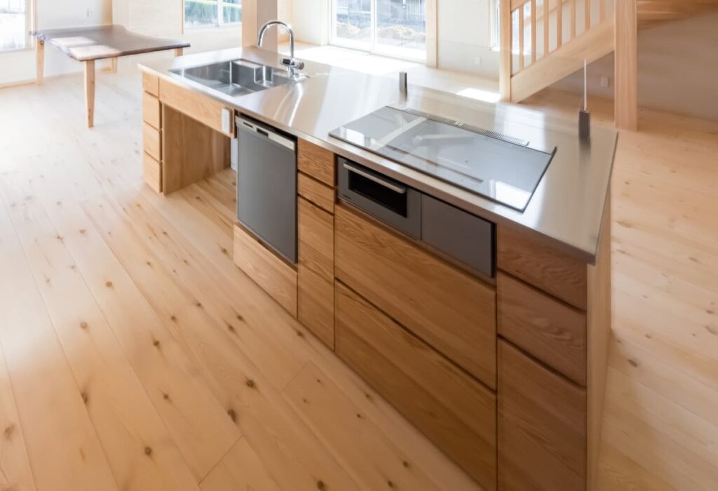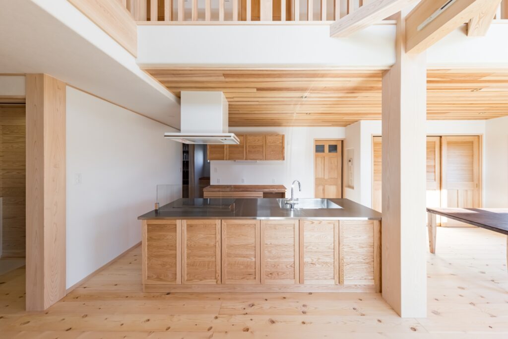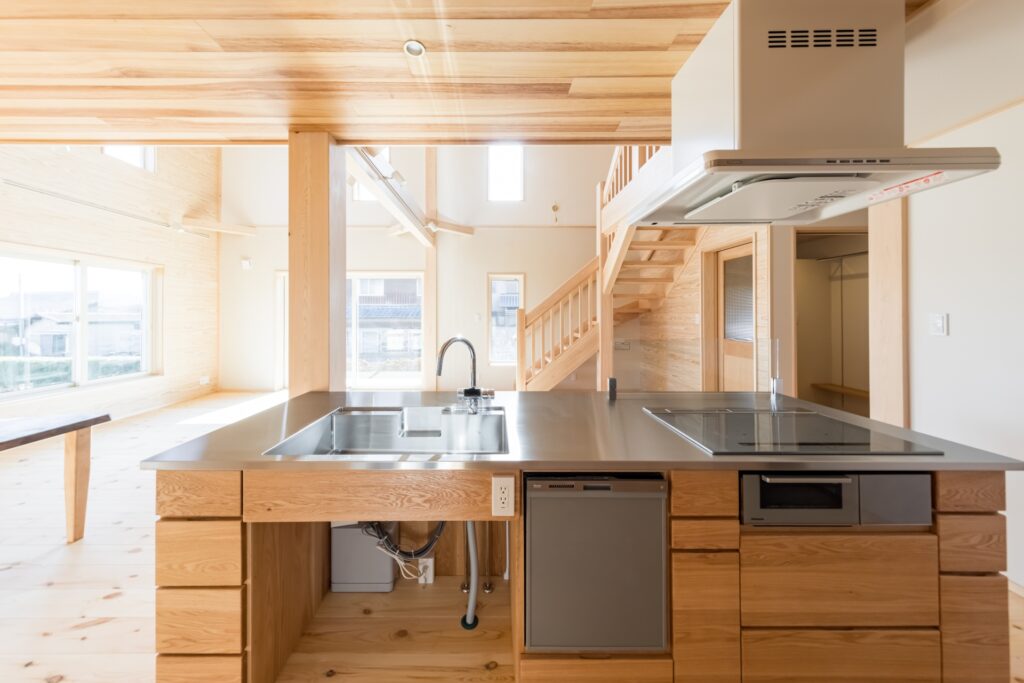 8寸の大黒柱にも引けを取らないキッチンは、天板をステンレス製にしたW2750×D940の大型アイランド。せこ住研オリジナルキッチンでキッチン本体、キッチン前扉付き収納もレッドオーク材で揃えた。