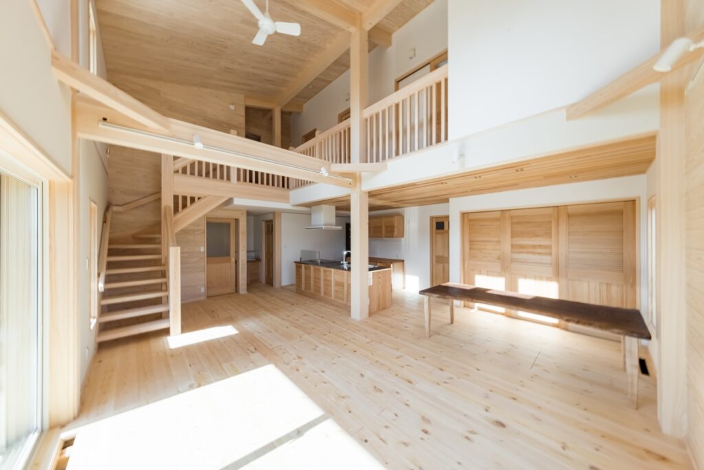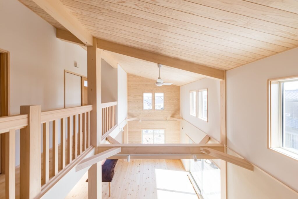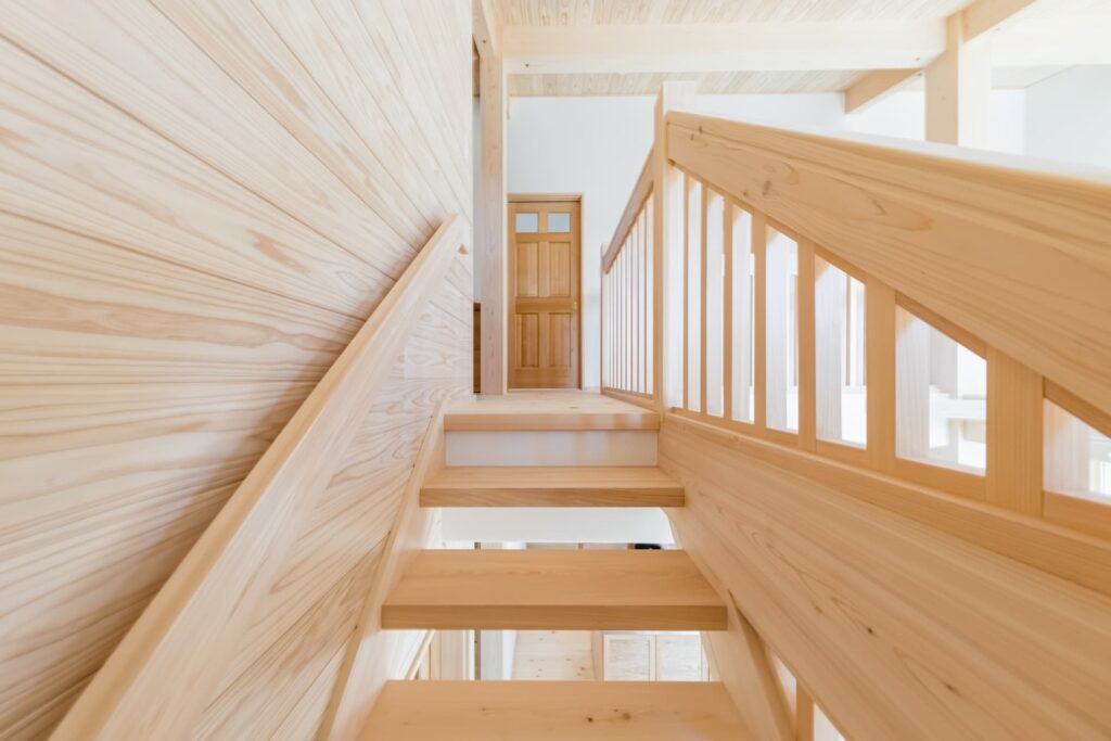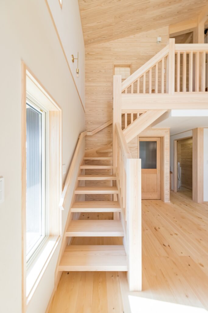 ストリップ階段。側板、踏板、手すり全てヒノキにて製作。無垢でできた階段は冬でも快適。