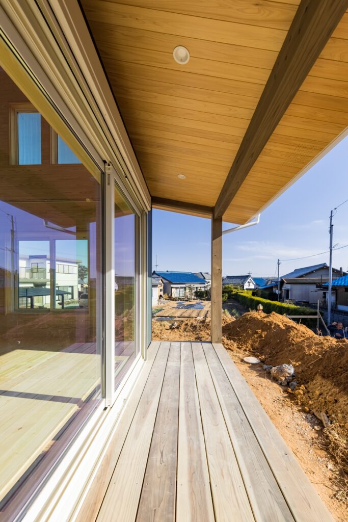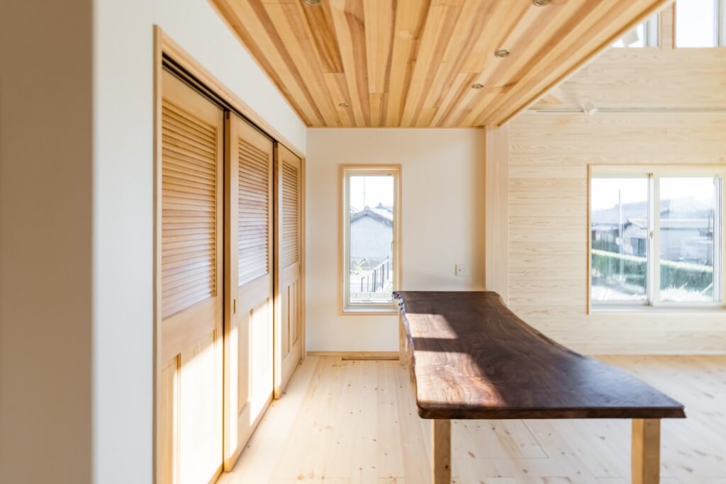 キッチンはご希望のアイランドキッチン。いつでも家族の様子を見渡せます。なるべく収納は隠したいとの事でダイニングには扉付き収納を。開けると沢山の収納棚と一部奥様の家事コーナーもあります。大きな掃き出し窓の外には広いデッキを設けて庭での団らん場所になっています。