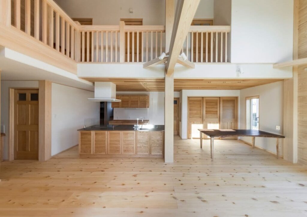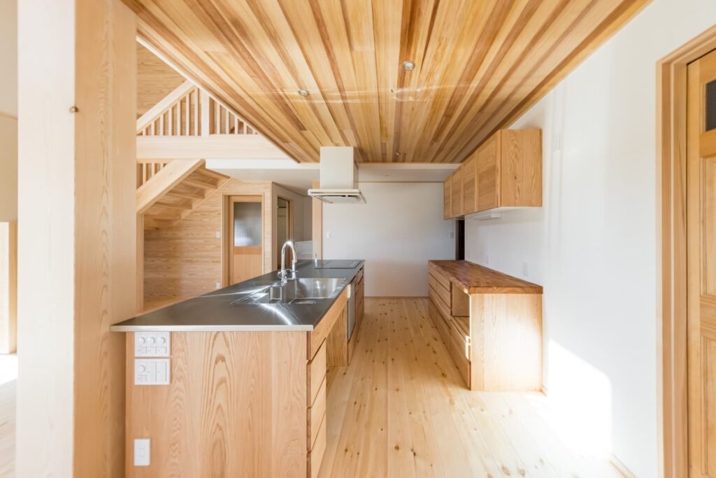 奥様のご希望でレンジフードはホワイト。DK天井はラオス松にゴールドのダウンライトに。