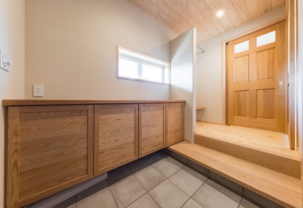 玄関は低めの下駄箱は床から浮かせて下部にも靴が入るように。ホールにはコート掛けと鞄置き場を設置。プライベート側の出入りには来客用も兼ねた洗面台もある。