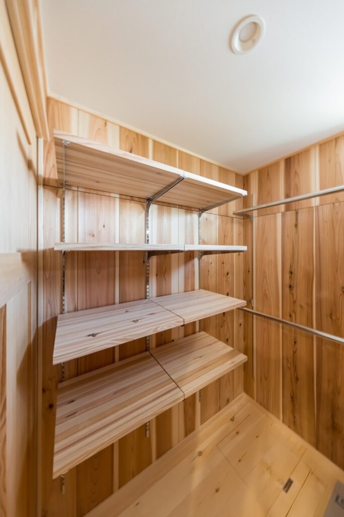 すぐ横には3帖のウォークインクローゼットがあり衣類は全て片付けられる。短い家事動線が嬉しい間取り。