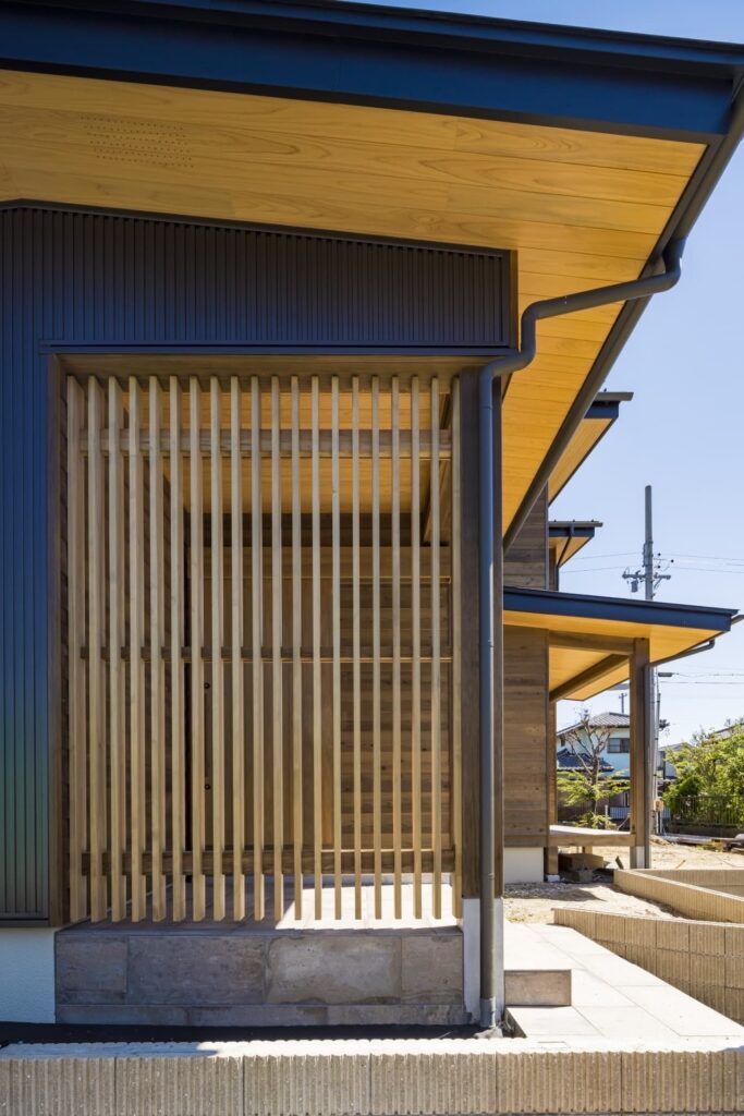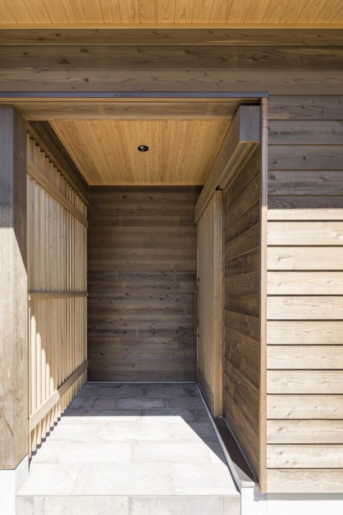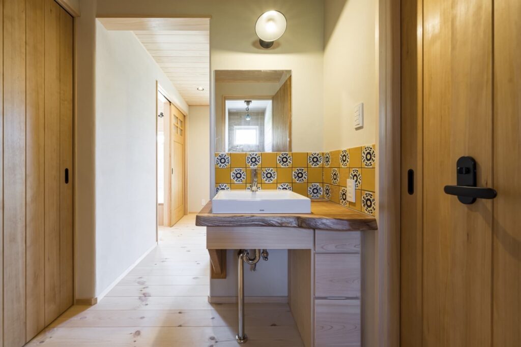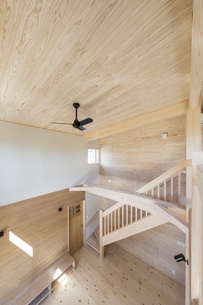 玄関からリビングを通らずに水廻りにいけるレイアウトとなっており、平屋の玄関ホールから吹き抜けで高さのあるリビングに入ったときのギャップがたのしい。「玄関を抜けると吹き抜けだった」みたいな。