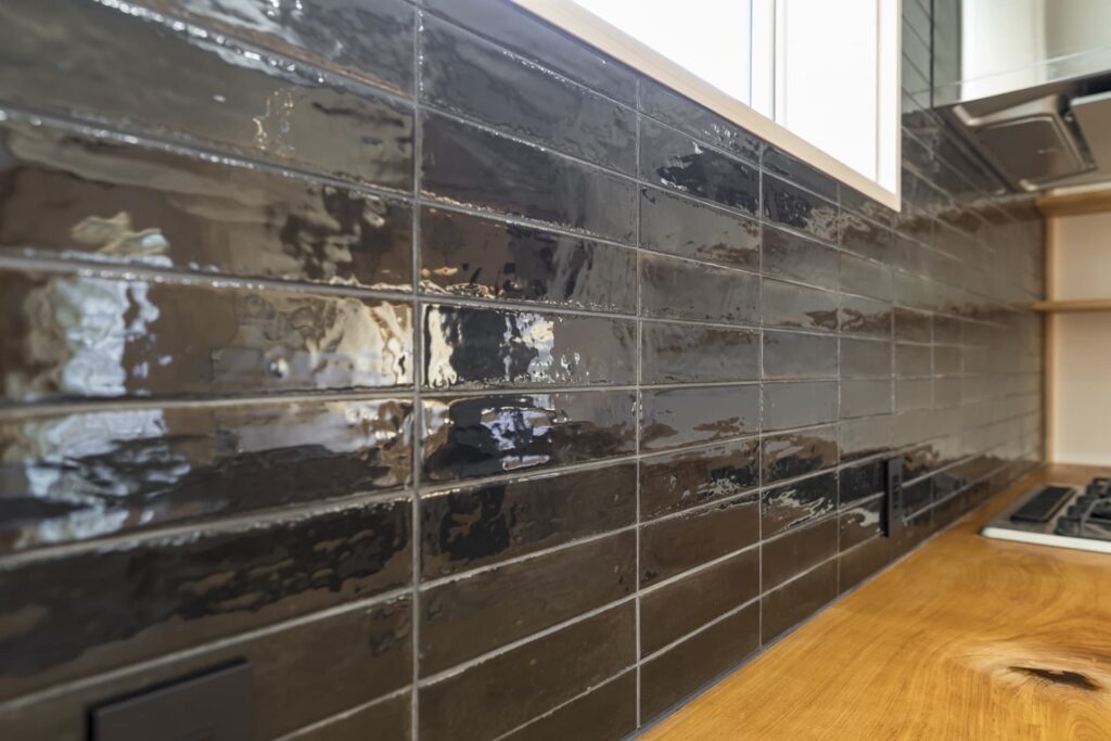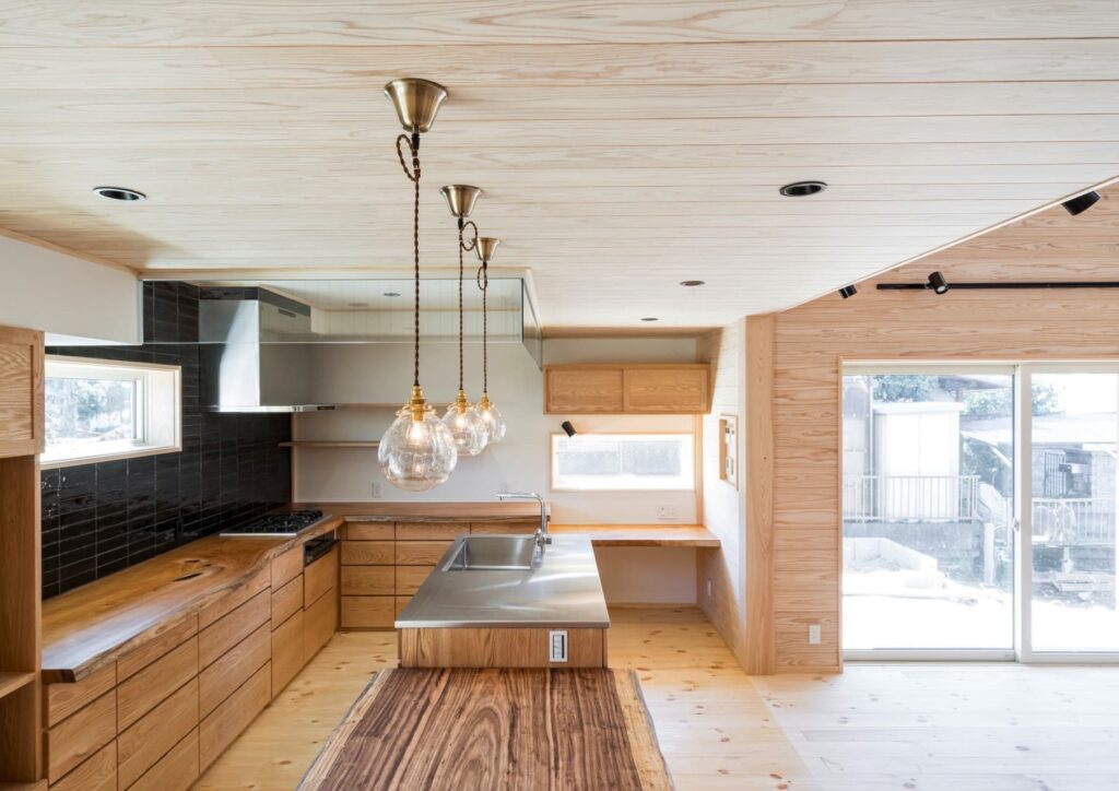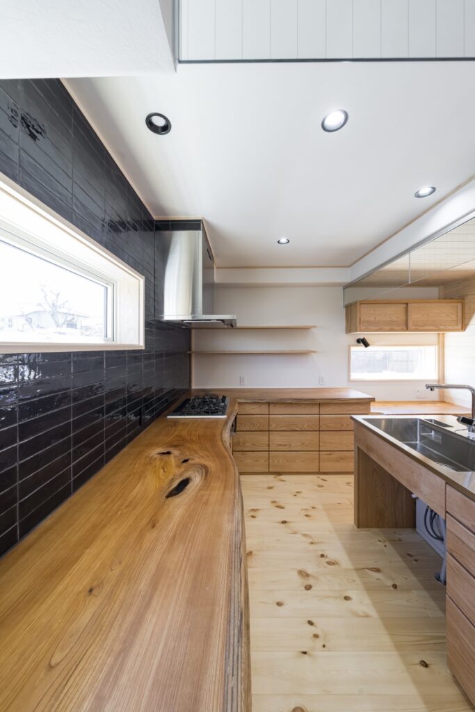 ケヤキの一枚板を使った特製のL型キッチン。自然樹形だが手前側にケヤキの幅広の部分を持ってきているのは、武蔵オーブンを設置するためである。