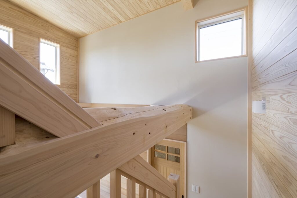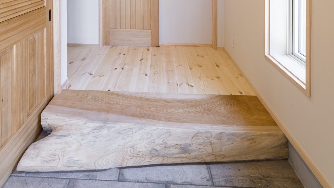 吹き抜けの「一番曲がった」タイコ梁と玄関の「なるべく変わった」上がり框。唯一無二の造形は木の生命力を感じさせる
