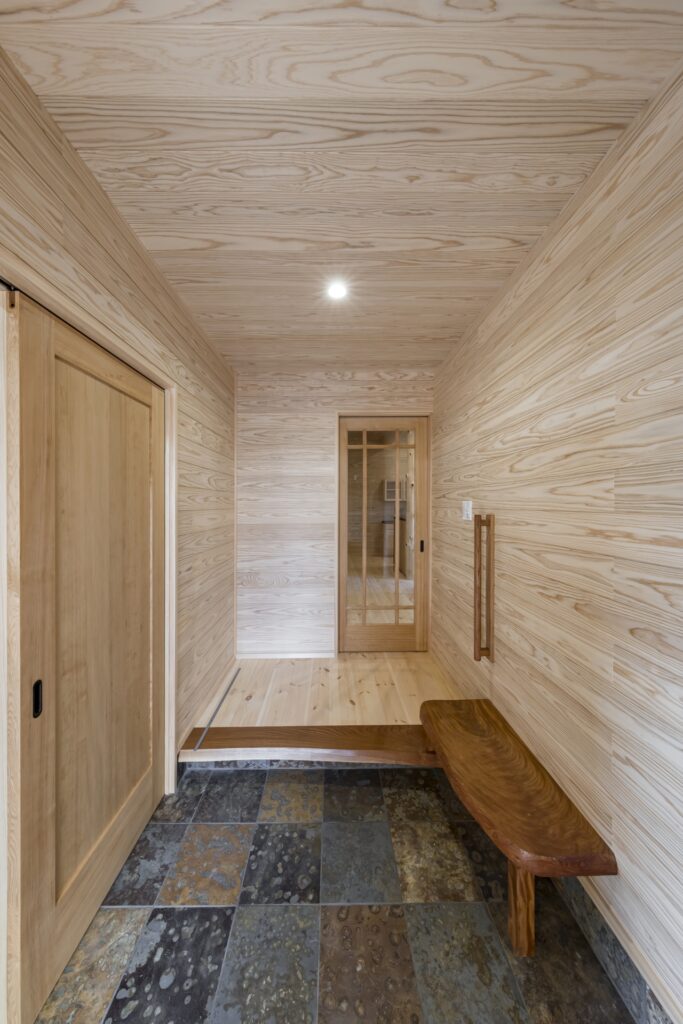 玄関ホールにはせこ住研オリジナルのケヤキでつくった大きなベンチと手摺。隣のシューズクロークには大家族のたくさんの靴を収納できます。