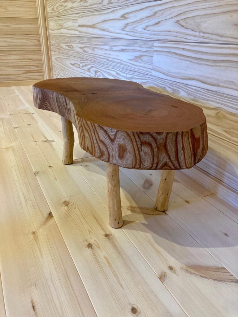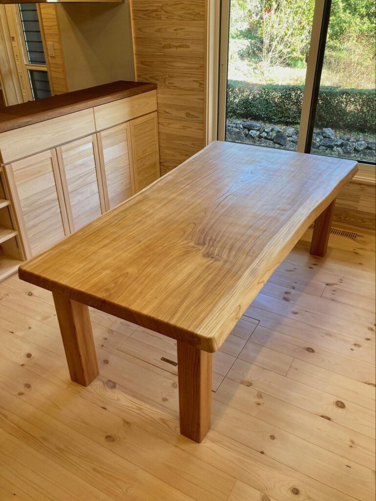 釣竿ラックもご希望に合わせて製作しました。かわいいひょうたん型のケヤキをちゃぶ台に。テレビ台は施主様デザインです。ケヤキの一枚板で樹形を活かしたテレビ台です。