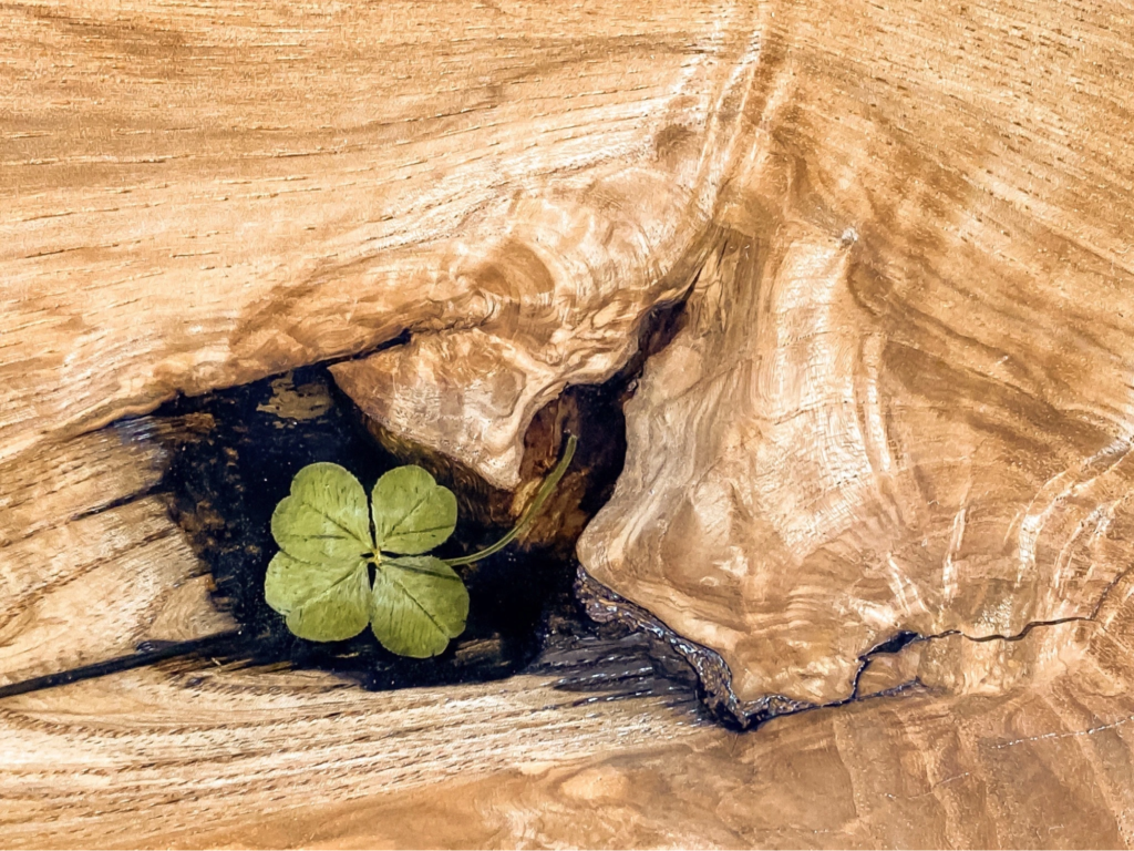 四葉のクローバーを埋め込みたいとご希望を頂きましたのでケヤキの板のへこんだ形状の所に埋め込みました。