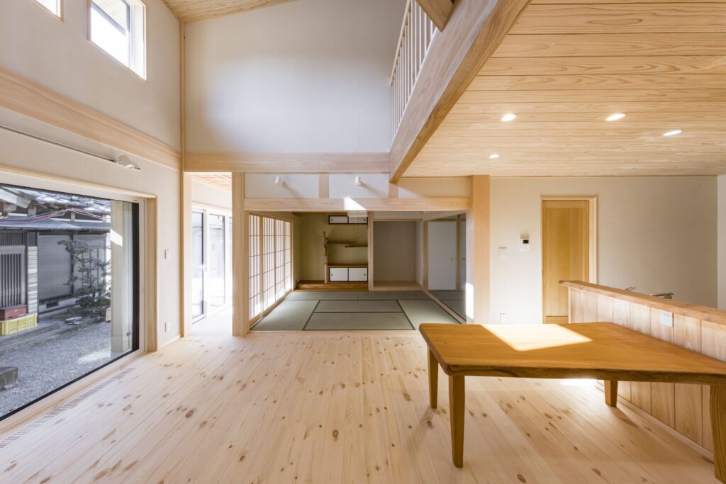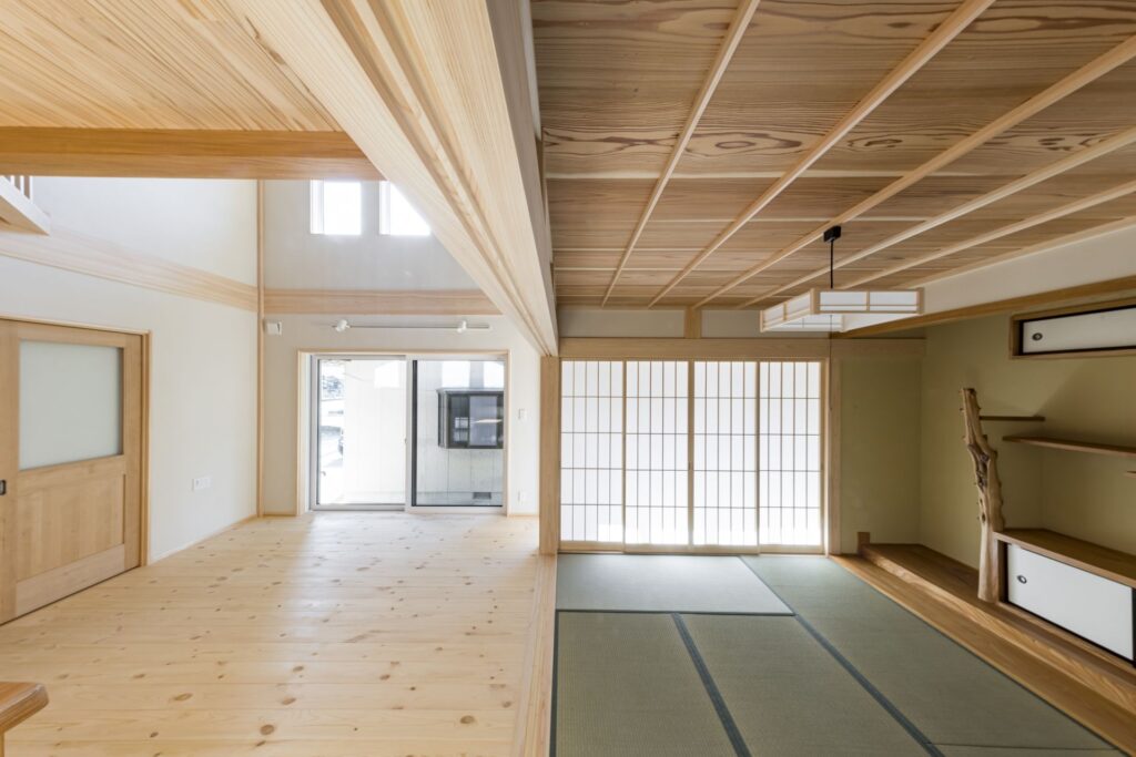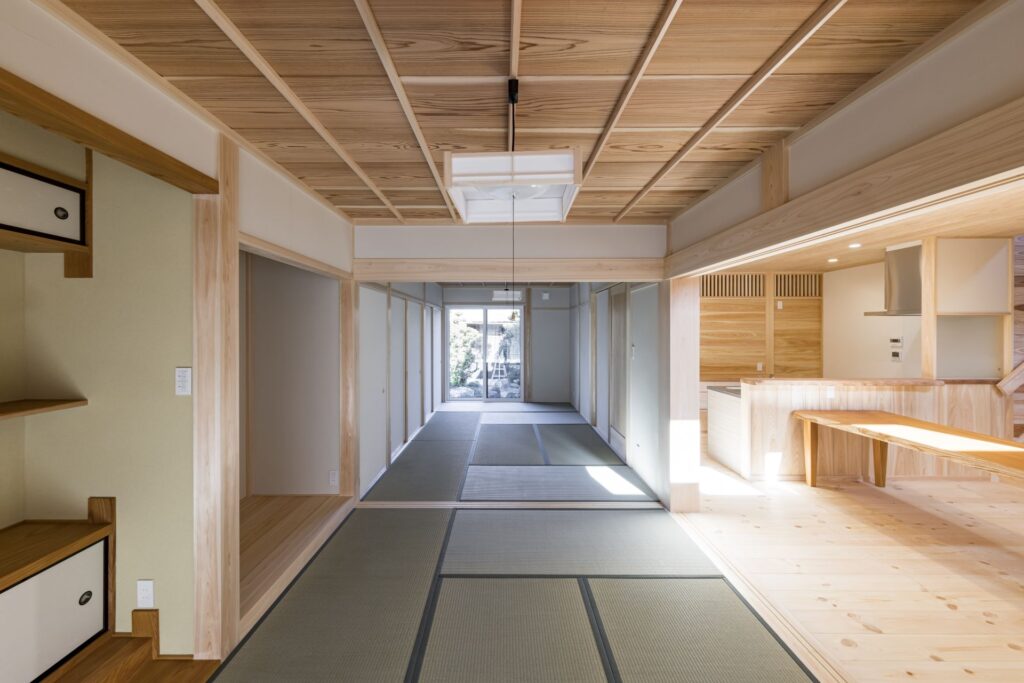 施主様の夢であった「違い棚のある二間続きの和室」。和室をリビングと一体にすることで解放感と汎用性を持たせた。和室へは縁側を設けることでリビングを通らずに入ることもできるようにした。