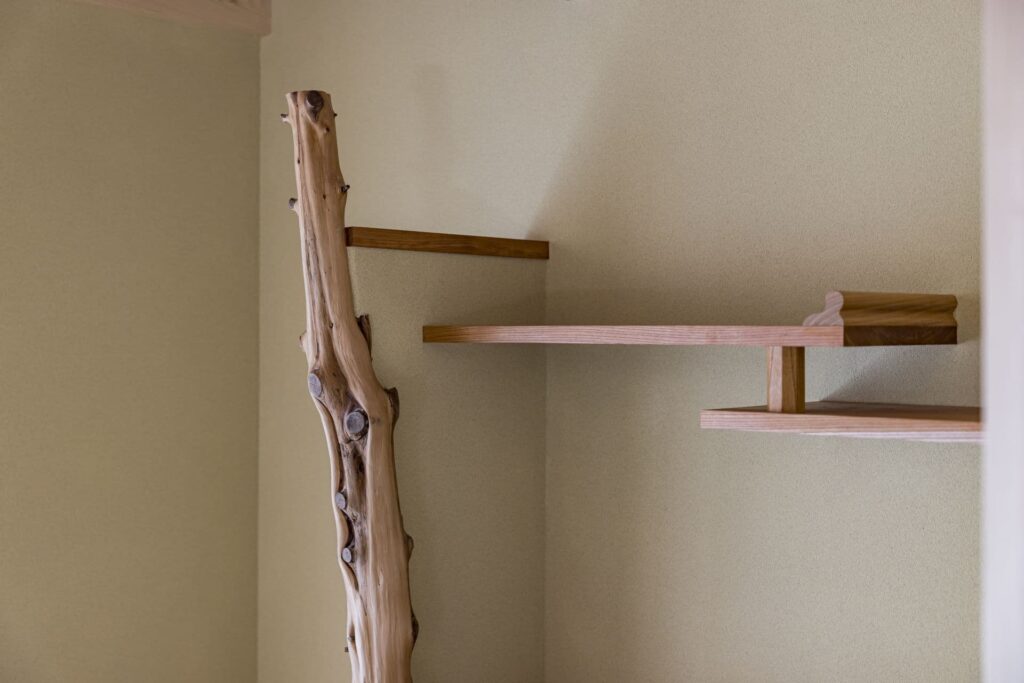 道路を挟んで神社の鎮守の森が広がっている。南側掃き出し窓すぐ外には既存の離れがあり景観は望めないので、せめて階段を上り下りするときに緑が見えるように工夫。