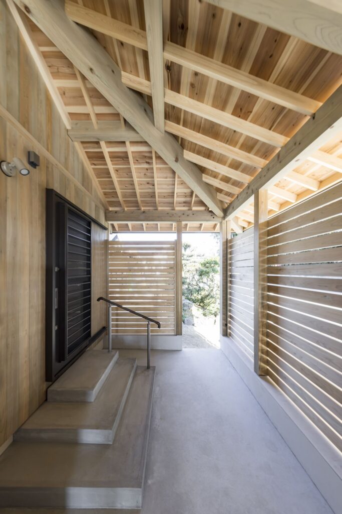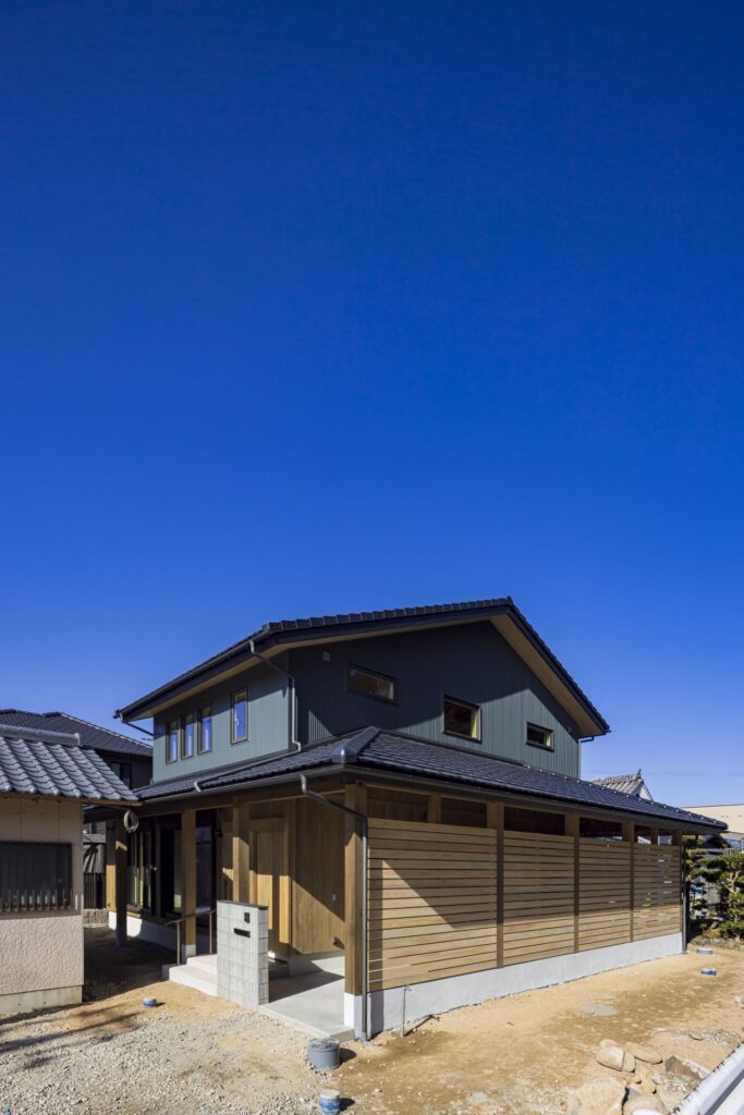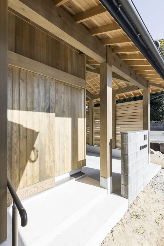 道路側に配置した玄関は家のテイストに合わせて和の要素を取り入れた。