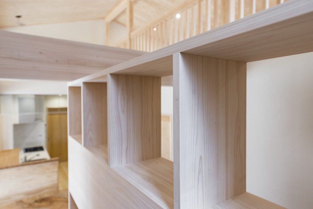 子ども部屋前に配置したスタディコーナー。大容量の本棚も製作。