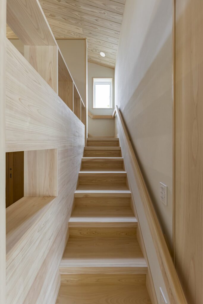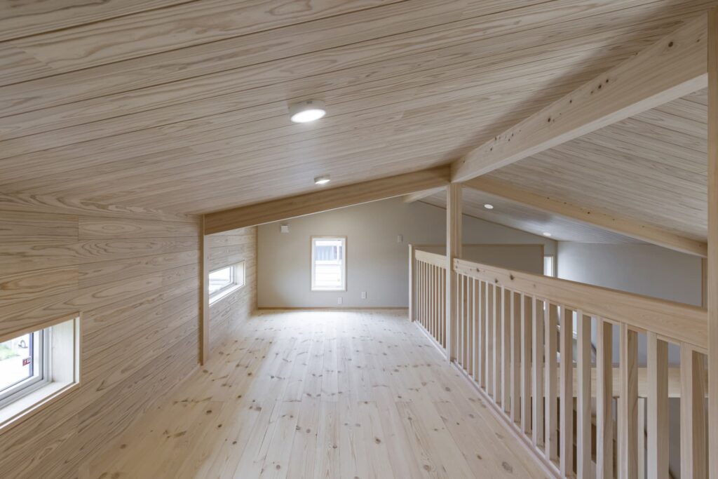 小屋裏空間は吹き抜けを介してLDKとつながっている。手すり側は成人男性が無理なく歩ける高さとした。