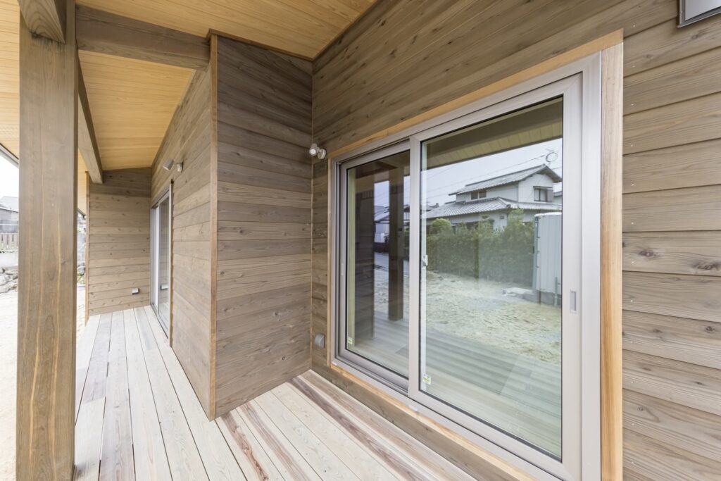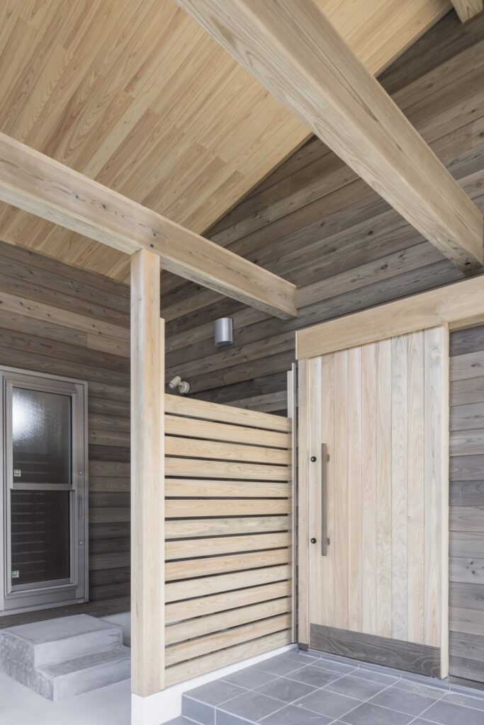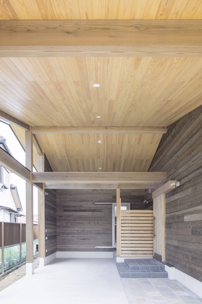 家から玄関ポーチを含む駐車スペースまで軒先が連続するシンプルで美しいフォルムとした。