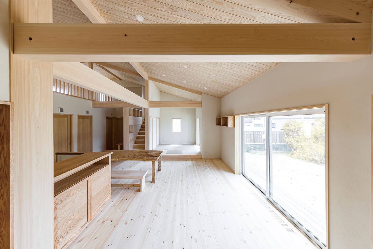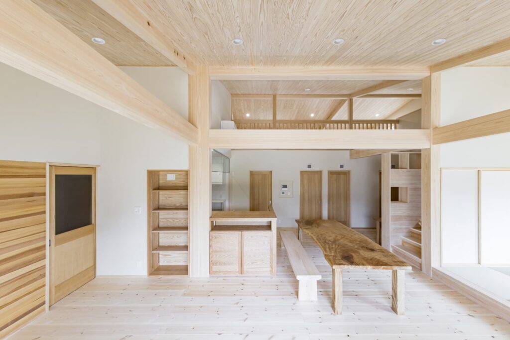 28畳のLDKにはスタディーコーナー、4.5畳の小上がり畳スペース。吹き抜けから小屋裏スペースも繋がっており広々とした空間となっている。