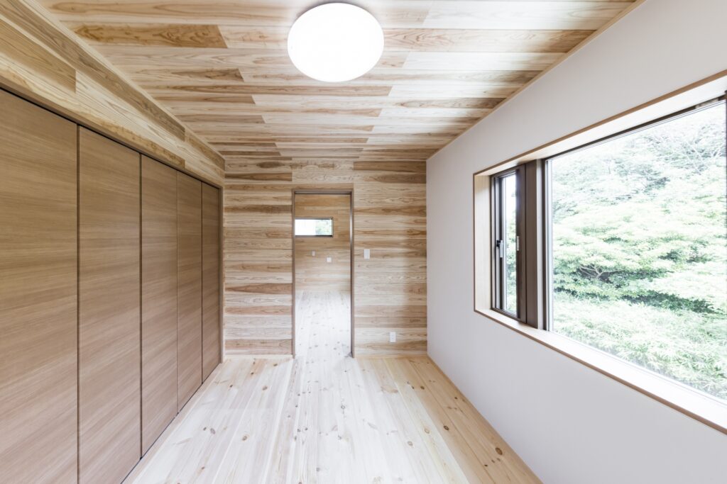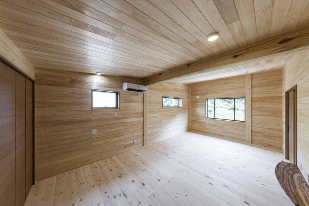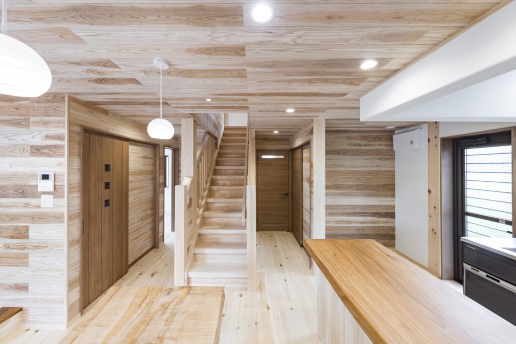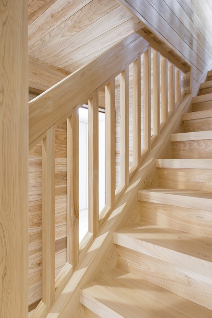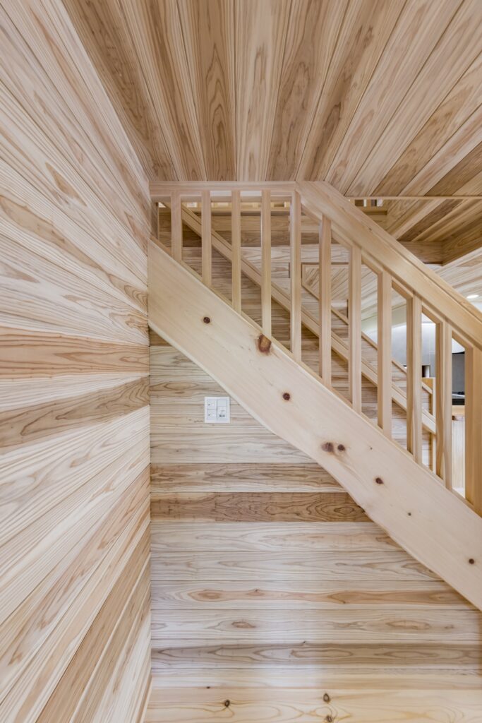 引き戸をあけるとヒノキの一枚板の階段側板がお出迎え。