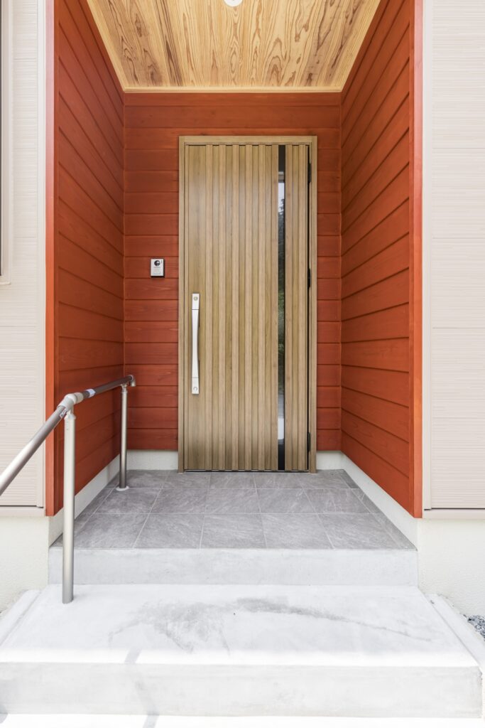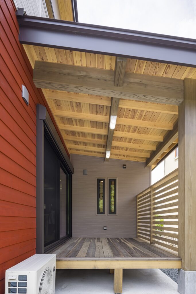 杉の鎧張の外壁は赤色に塗装。お客様をお出迎えするお洒落な明るい外壁。奥行のあるウッドデッキは雨の日も安心です。
