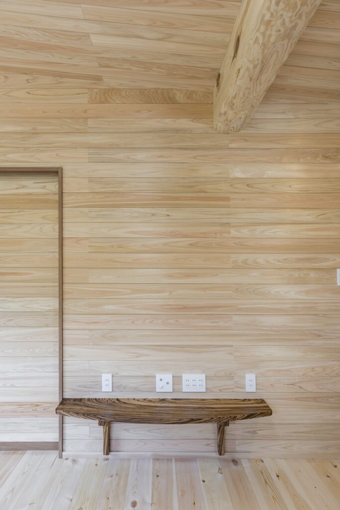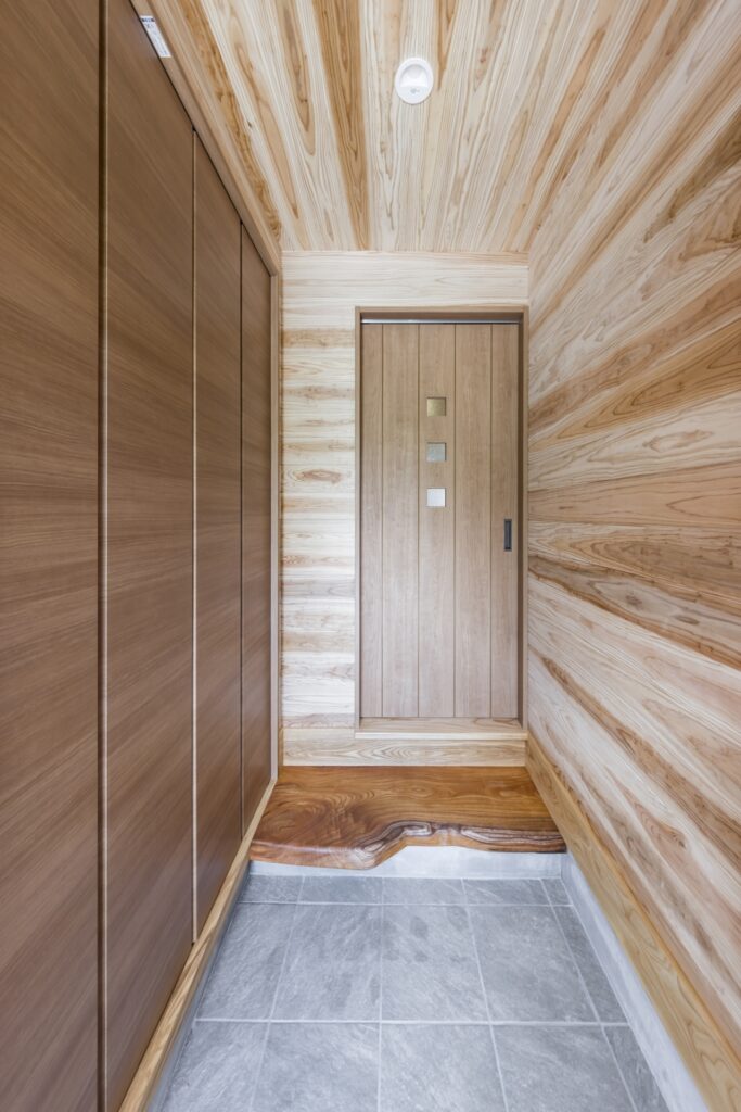 玄関ホールは樹形を活かしたケヤキの式台でお出迎え。