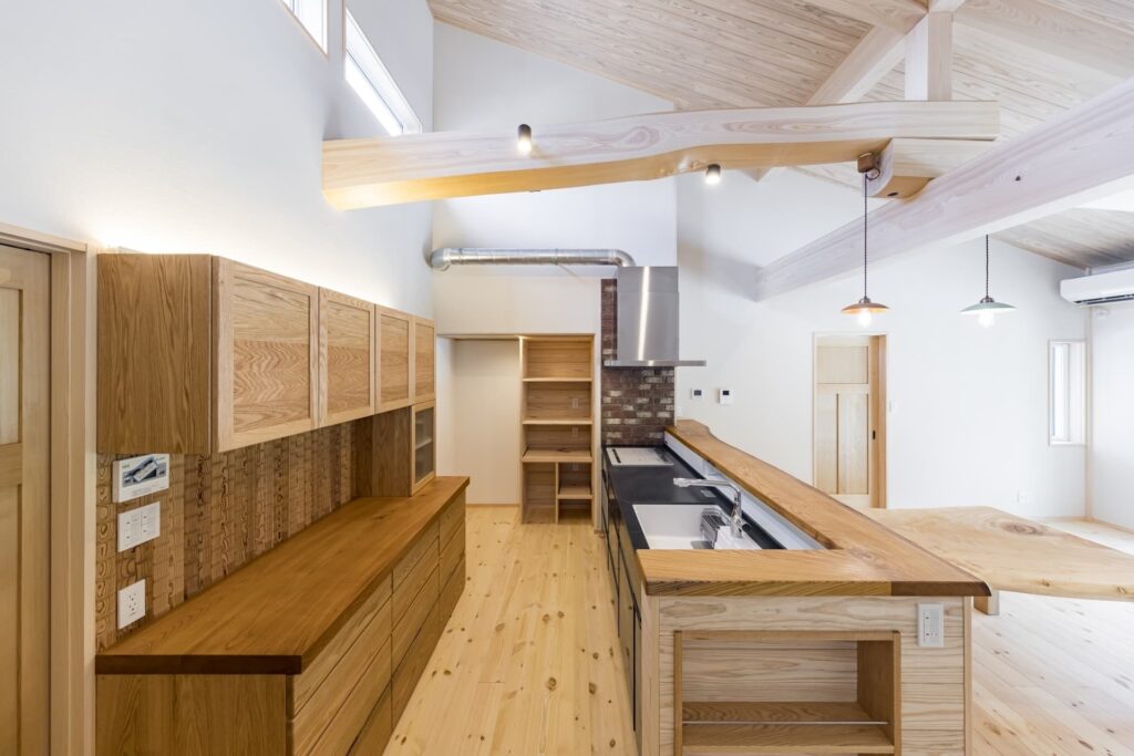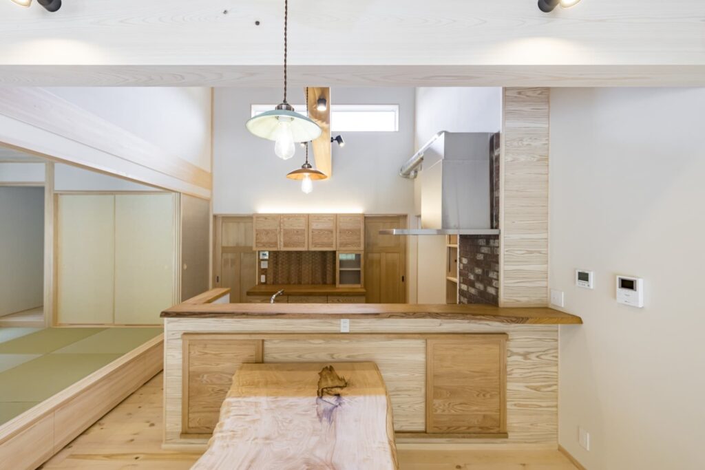 34坪の平屋は行き止まりのないキッチンを中心とした回遊型プランでどこへもすぐに行けるのが嬉しいです。